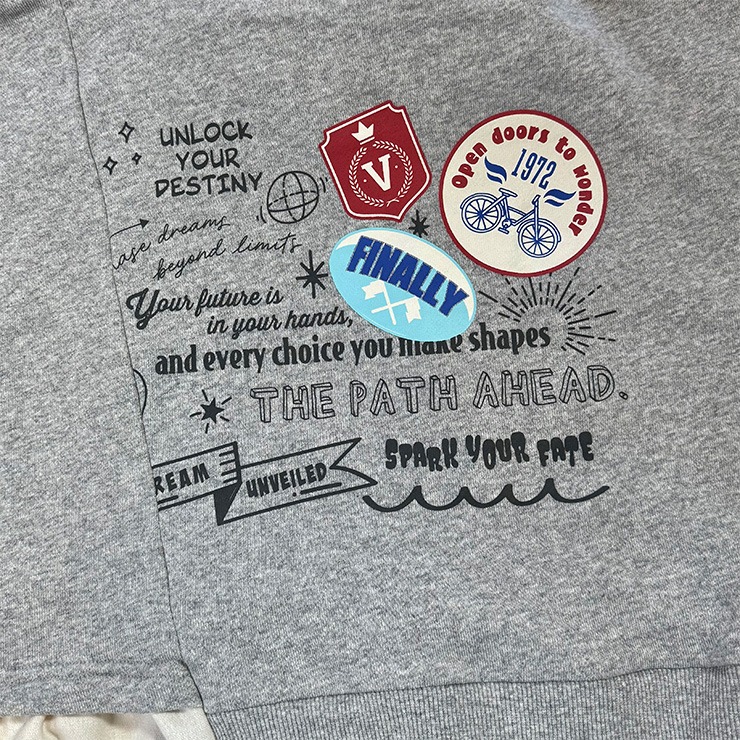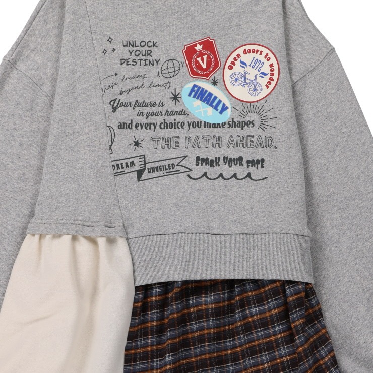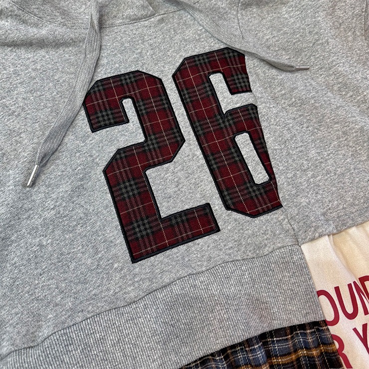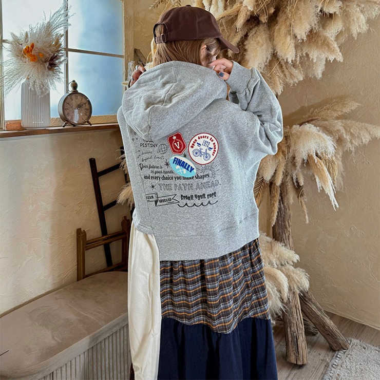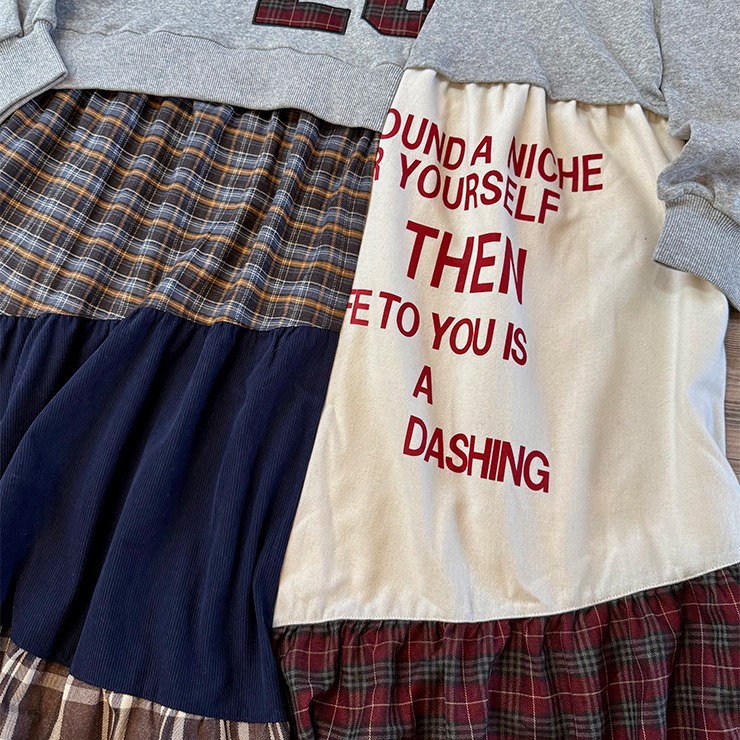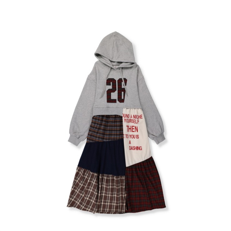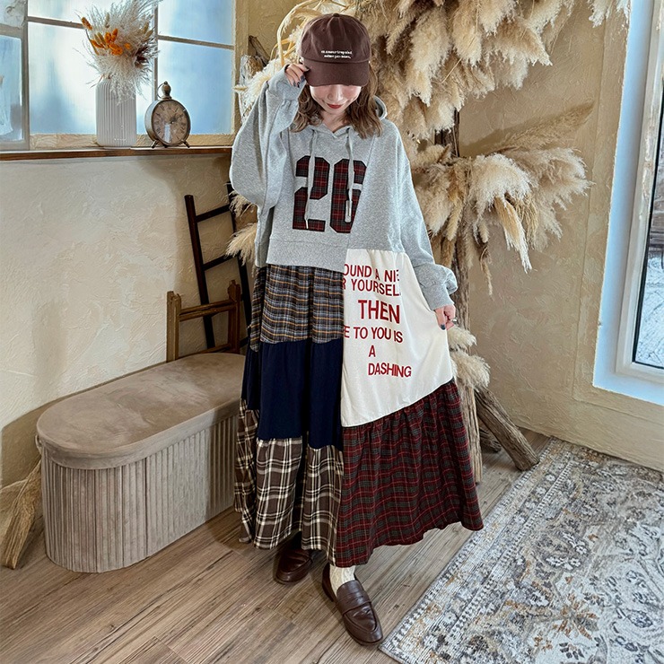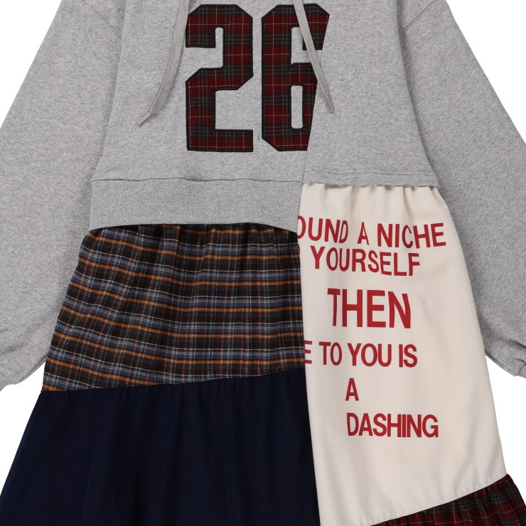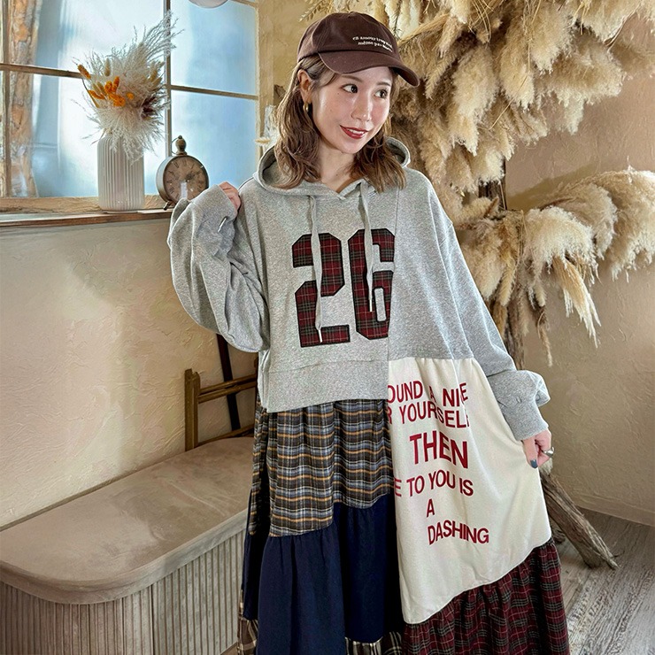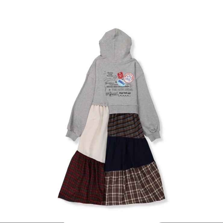 ボディもスカートもパッチワークデザインで、可愛いがぎゅっと詰め込まれた唯一無二なリメイク風のフーデットワンピース。