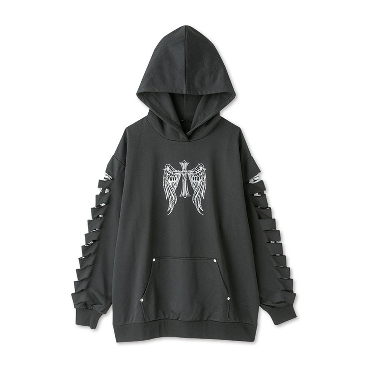 十字架のラメプリントとダメージ加工入りの2重袖が魅力的なデザインで、存在感を放ちます。