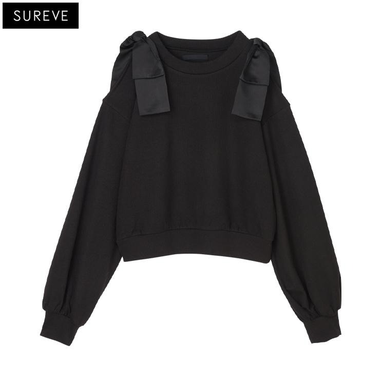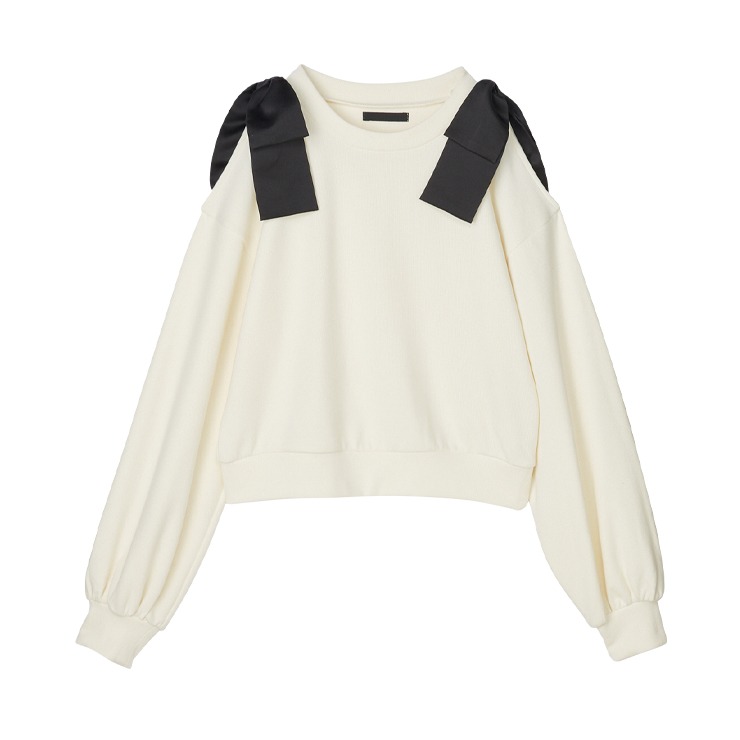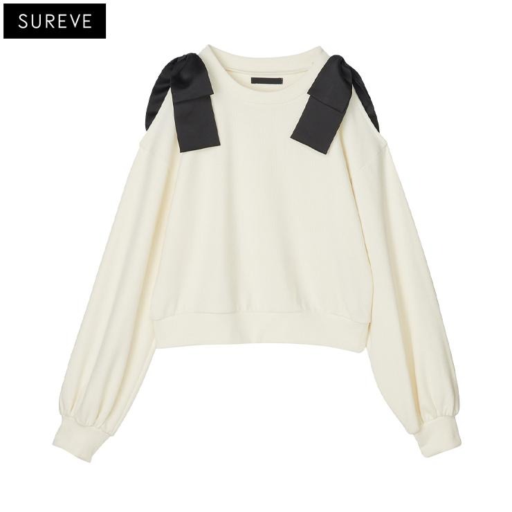 肩のリボンが大人かわいい、肩開きプルオーバー。