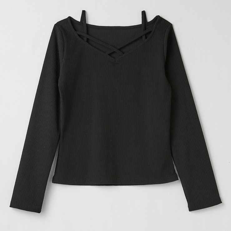 ネック部分のクロススデザインが、個性的なアクセントのリブトップス。