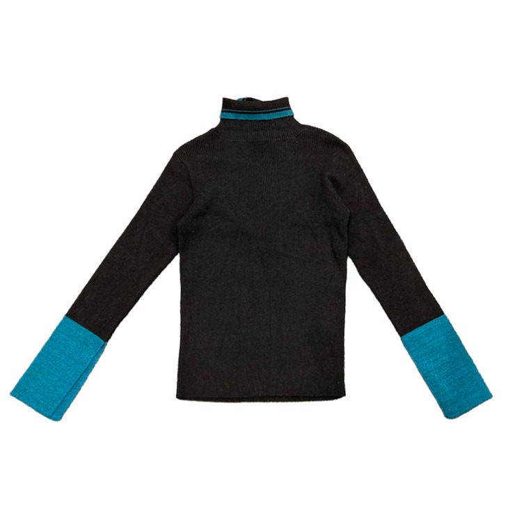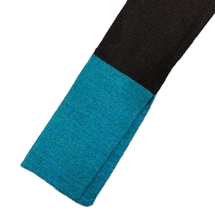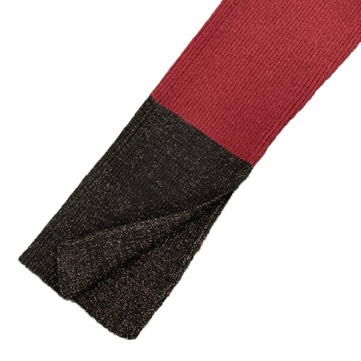 ネックには細めのライン配色、袖口にはラメ糸を引き揃え控えめながらもコーデのアクセントになる一枚。