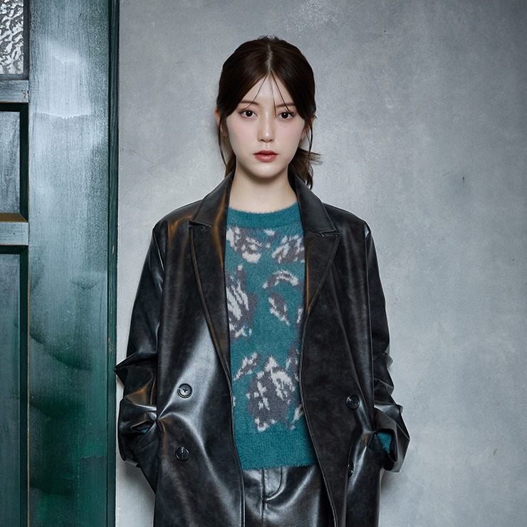 くすみ系の配色がモード感を演出し、ブラックボトムスとの相性◎