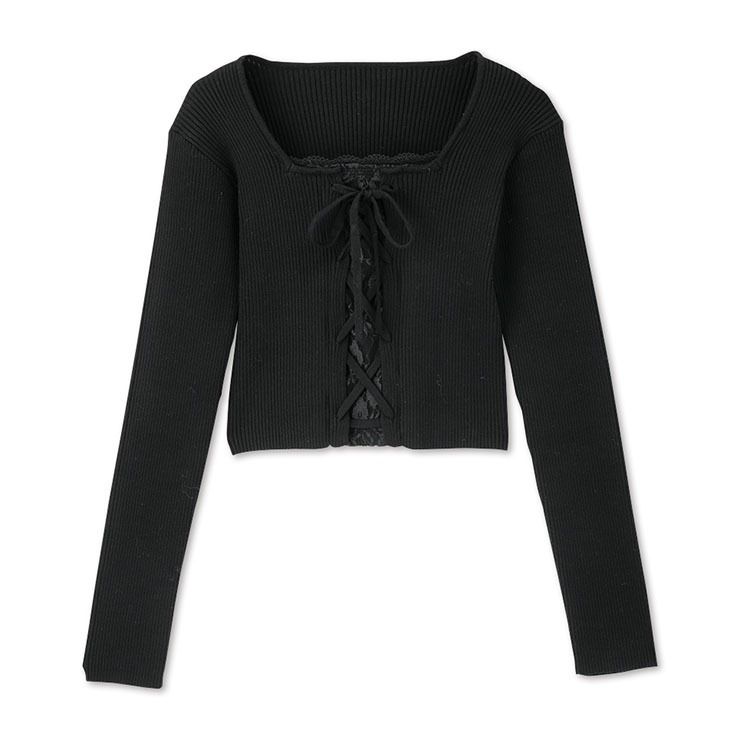 フロントのレースアップとレース生地の配色が華やかなデザインのニットトップス。