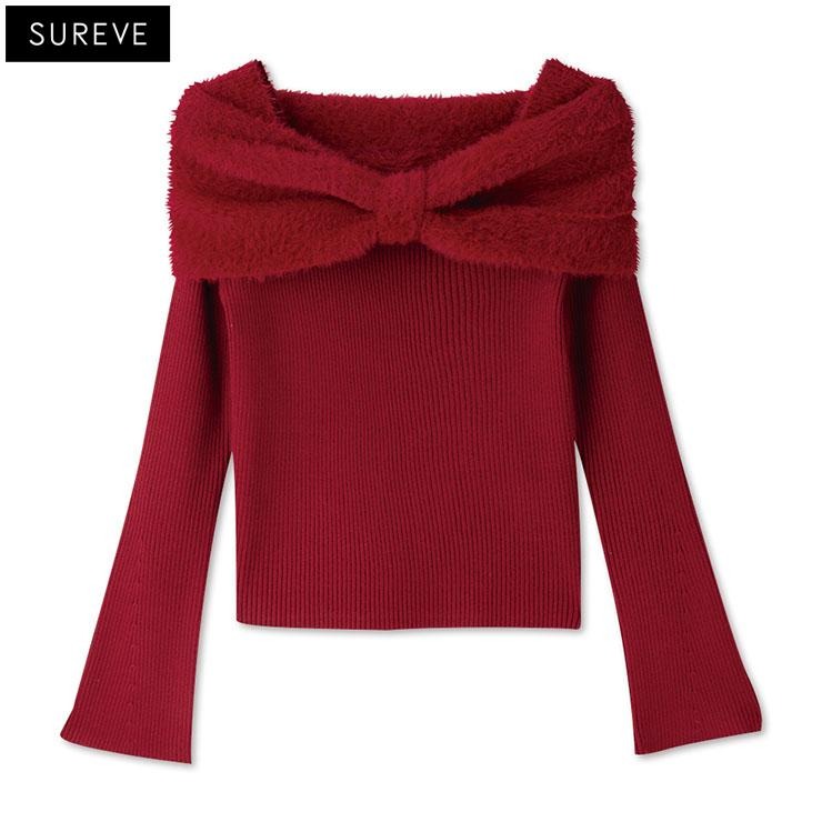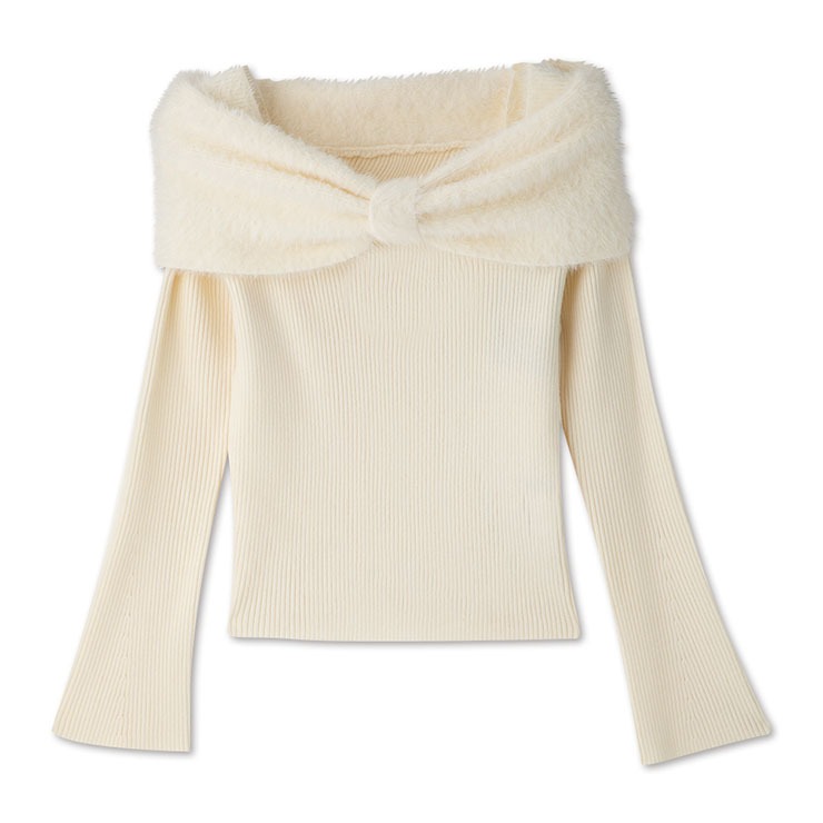 シャギー素材のリボンデザインがアクセントのオフショルニットプルオーバー。