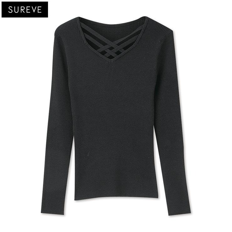 胸元でクロスしたテープが特徴的なニットプルオーバーです。