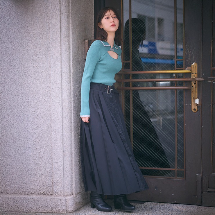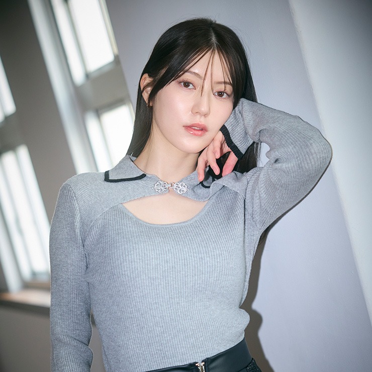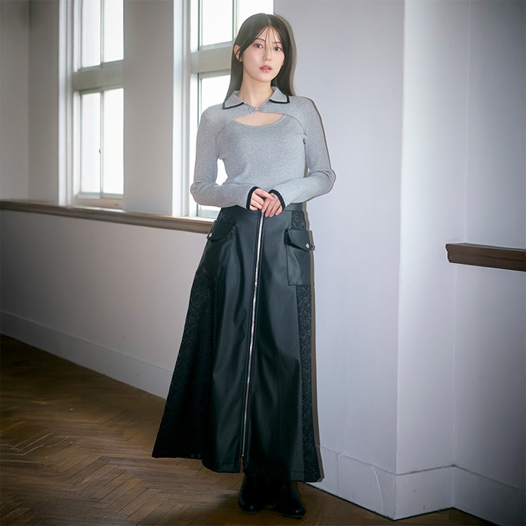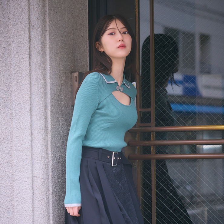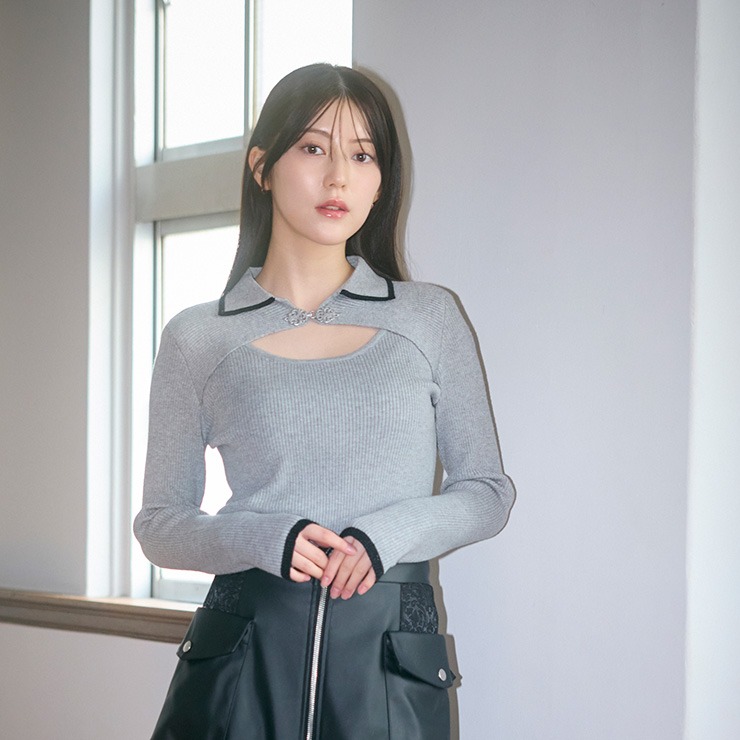 フロントのメタルフックが目を惹くニットプルオーバー。