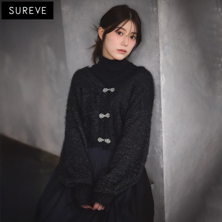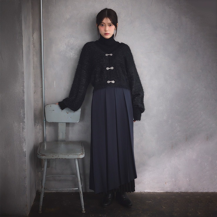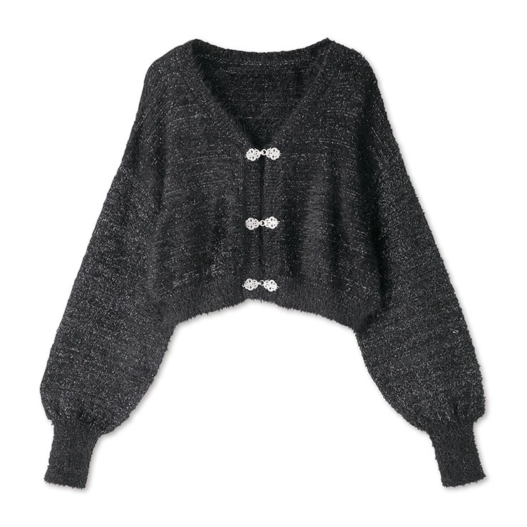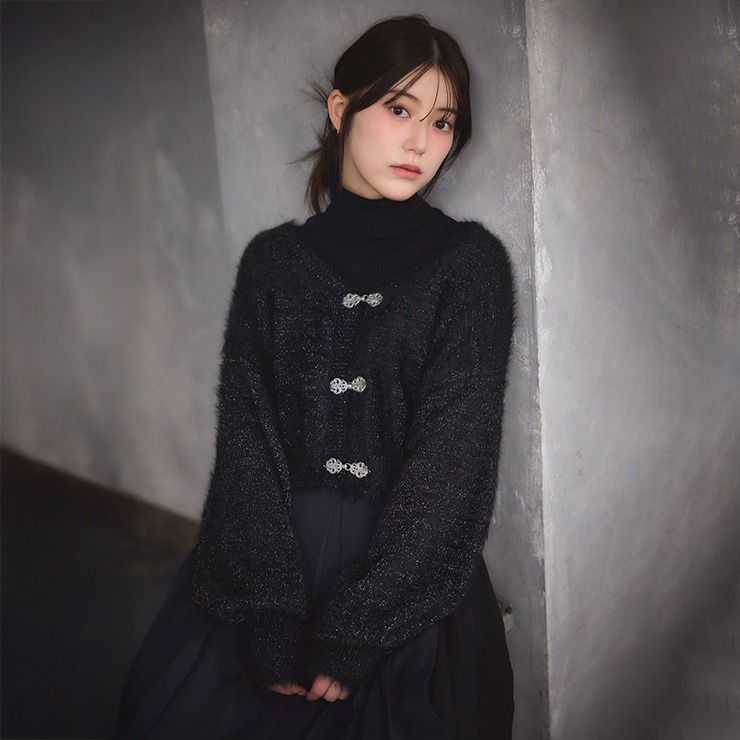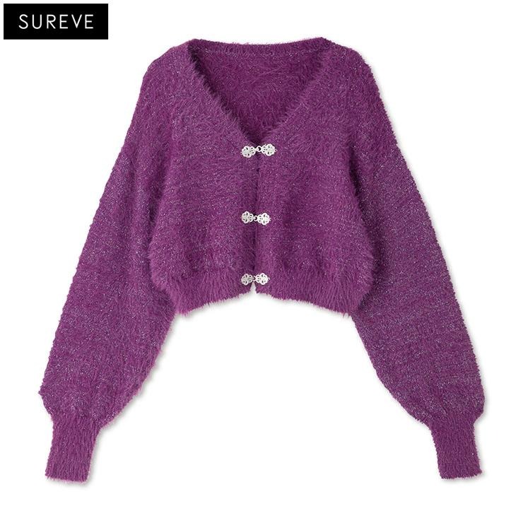 毛足感のあるシャギー素材とラメ糸をミックスさせたニットカーディガン。