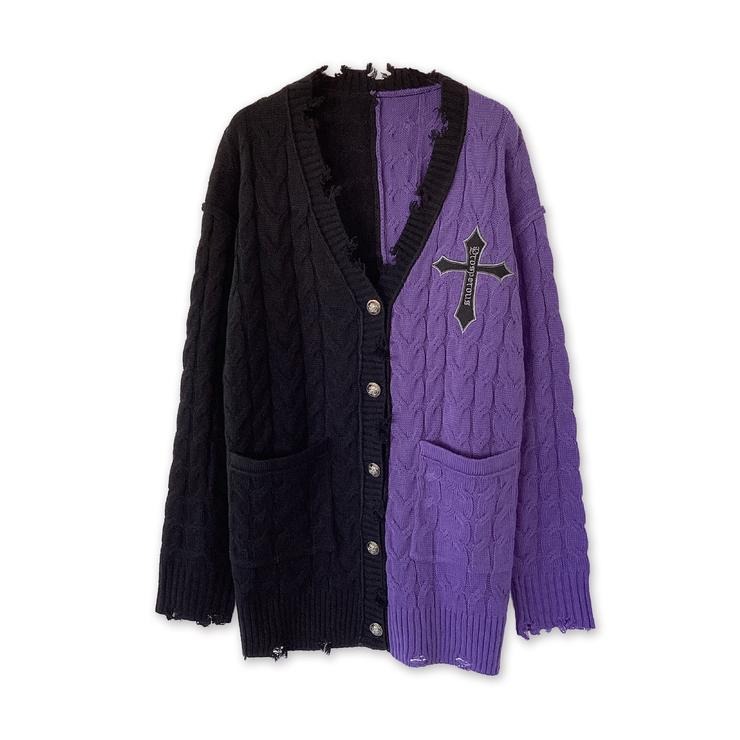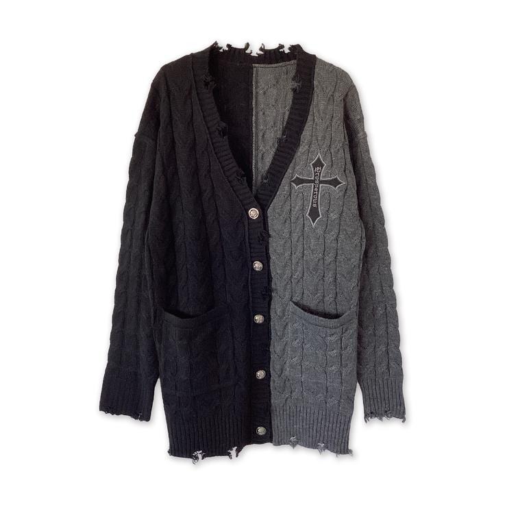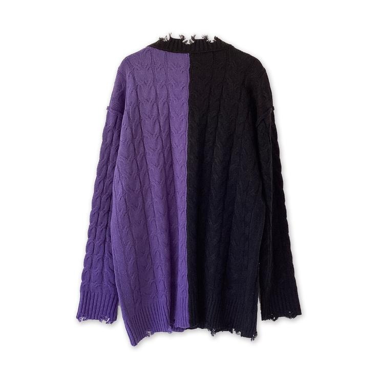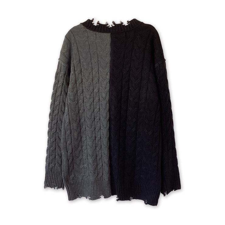 袖口と裾、襟ぐりに施したダメージ風のデザインがポイントのカーディガン。