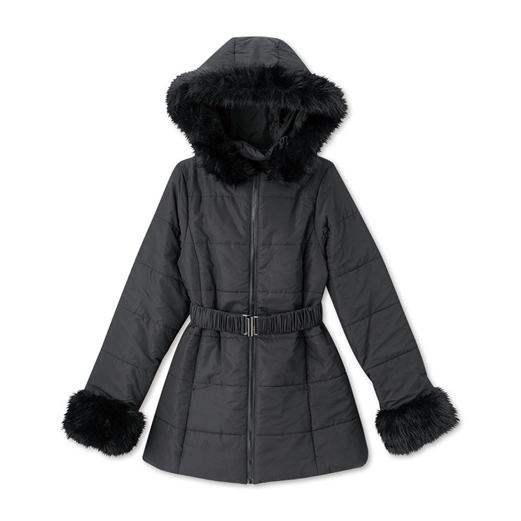 フード周りと袖先にファーのついた中綿ミドル丈コート。