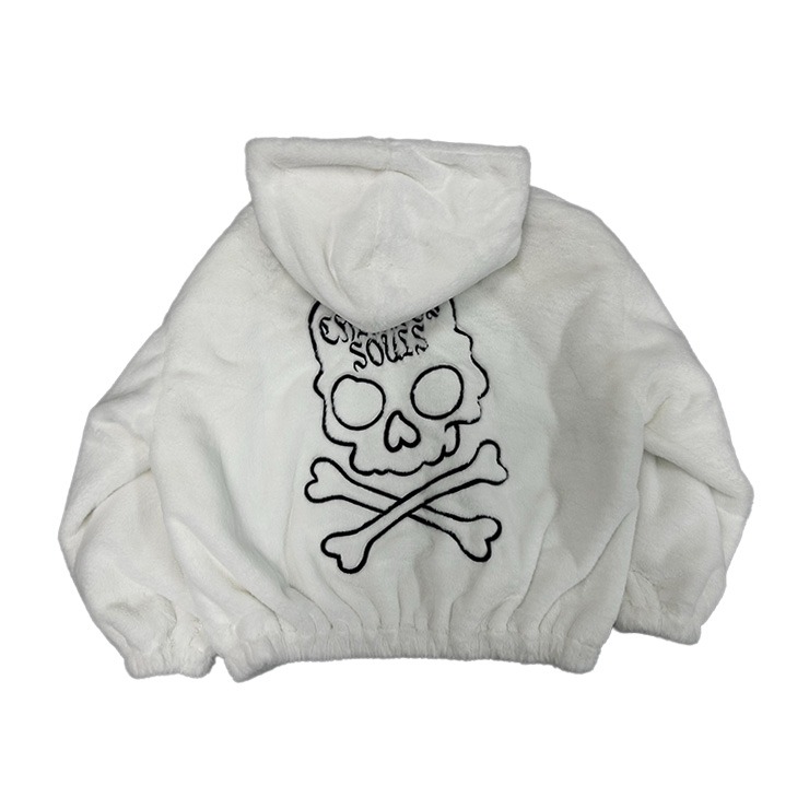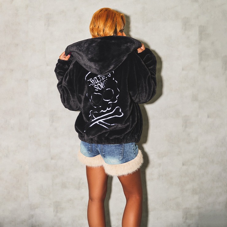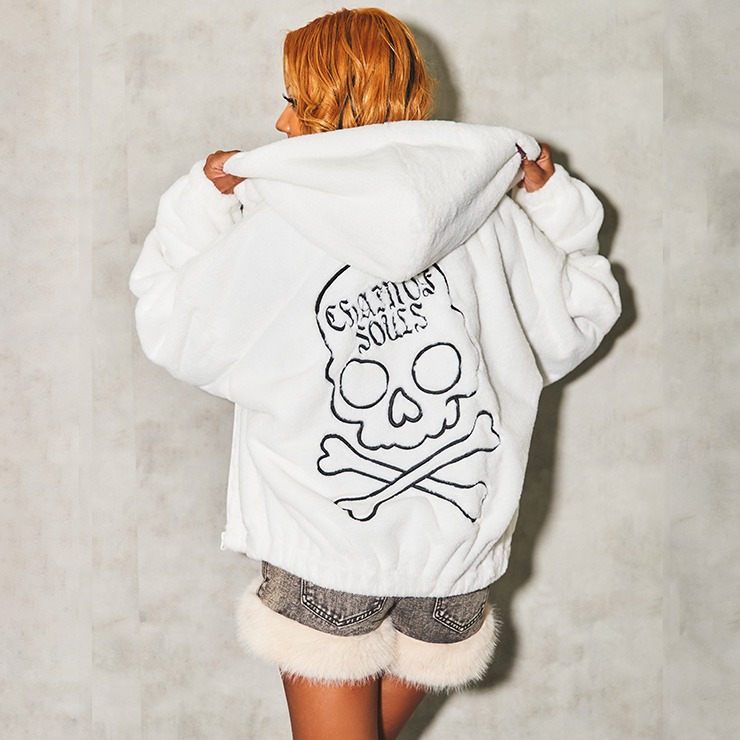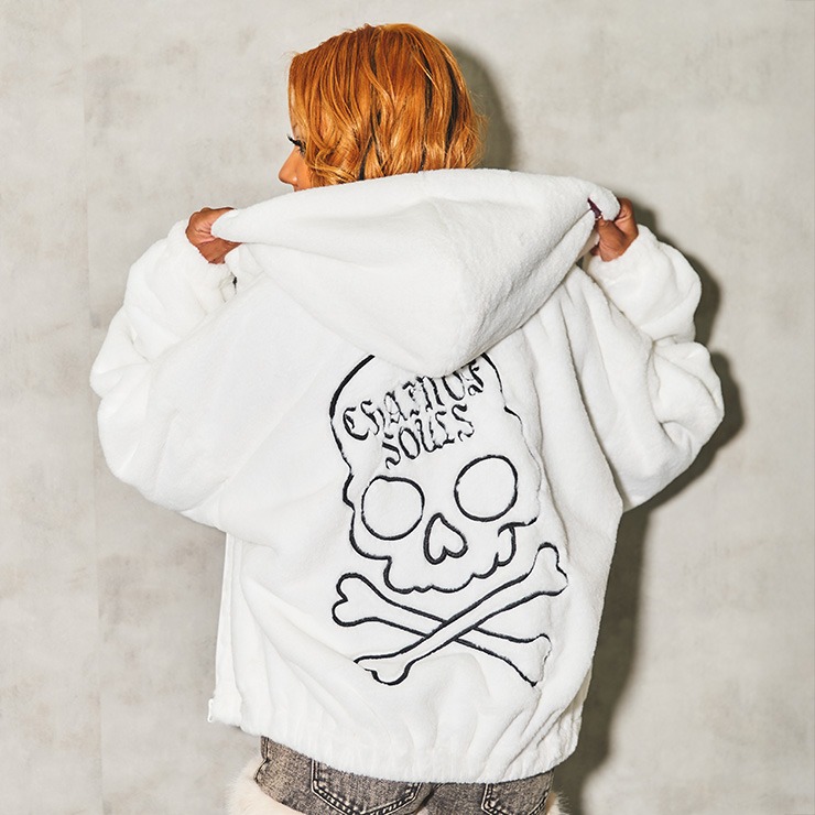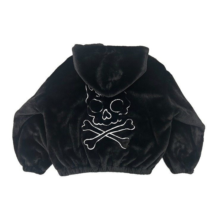 背中に大きなドクロデザインをあしらった、存在感抜群のファーブルゾン。