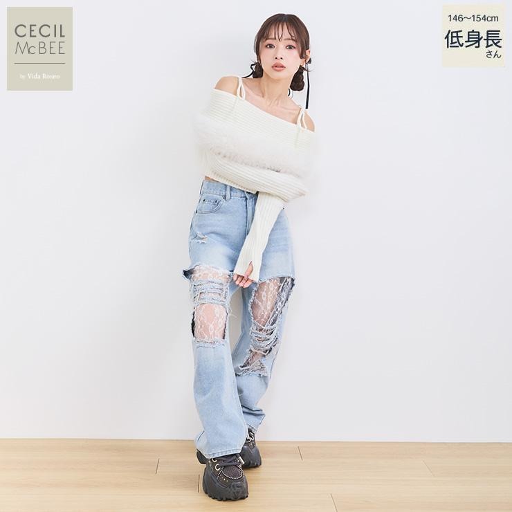 ダメージ加工デニムにレースパネルを組み合わせた、存在感のあるデザインパンツ。