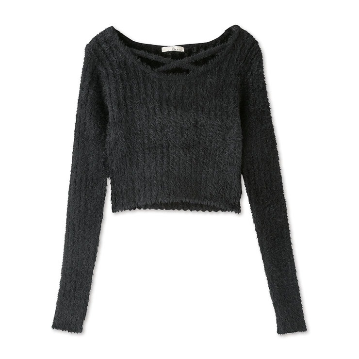 コンパクトなショート丈トップスはネックにクロス紐デザインで今っぽく。