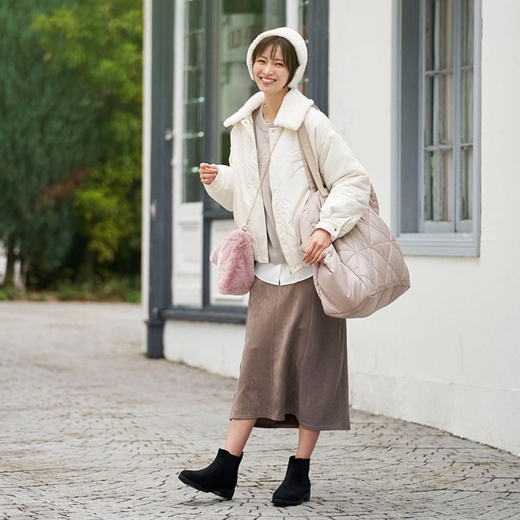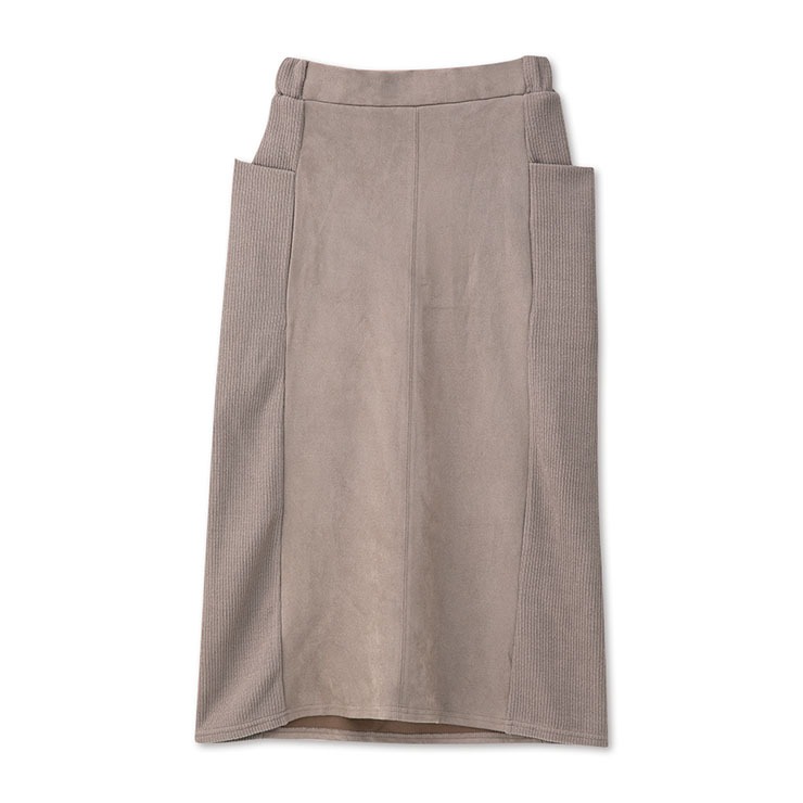両側にリブニットソーが切り替えてあるナロースカートは、微起毛素材がベースになりアイテムに価値を出しています。
