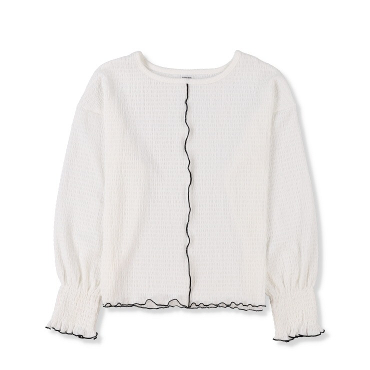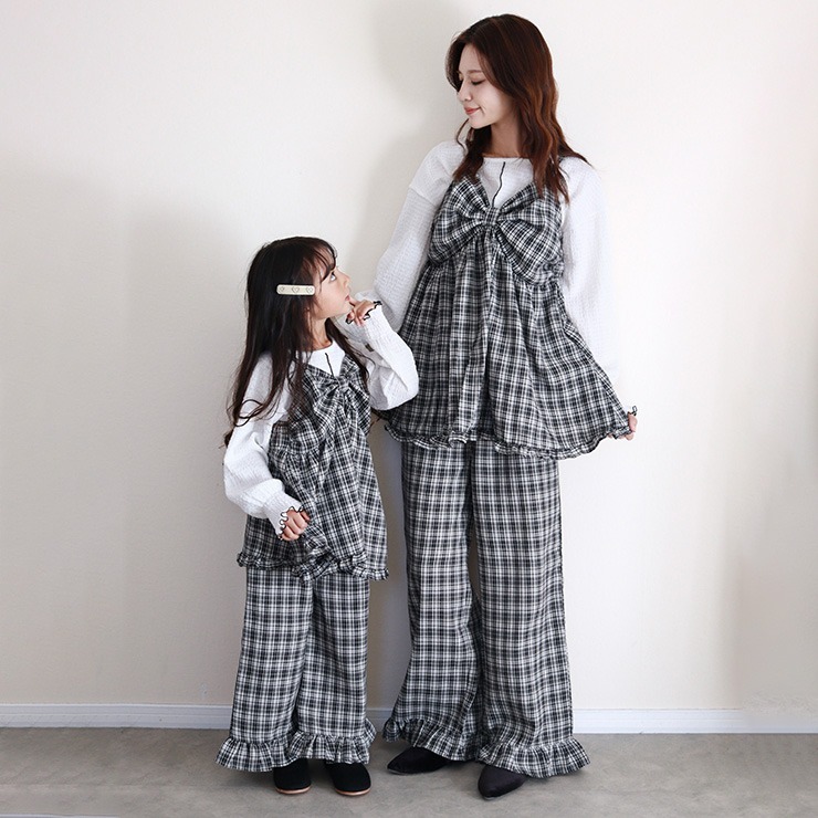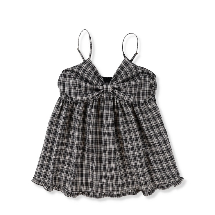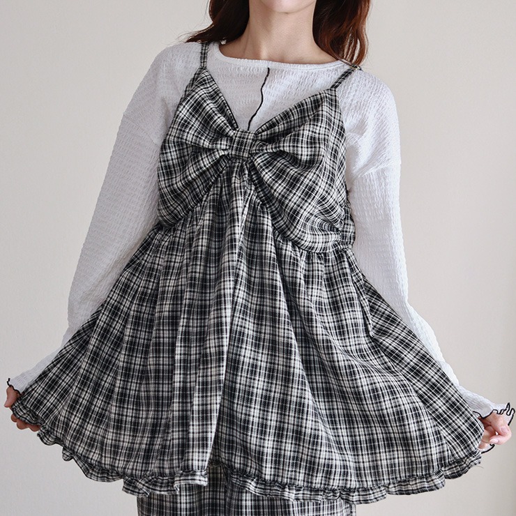 キャミソールの胸元部分はリボンのディテールをあしらい、裾部分は身生地を使ったフリルのデザインでとってもかわいいです。