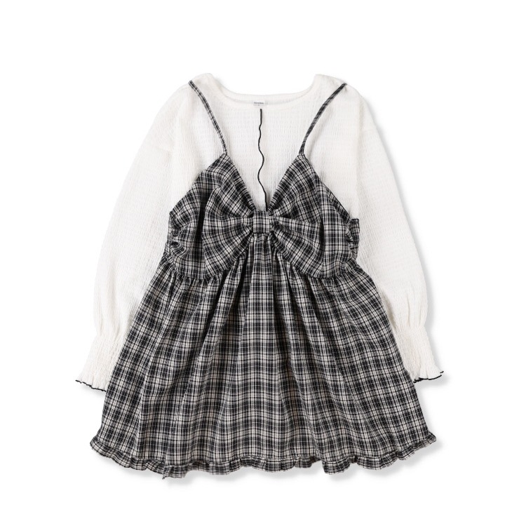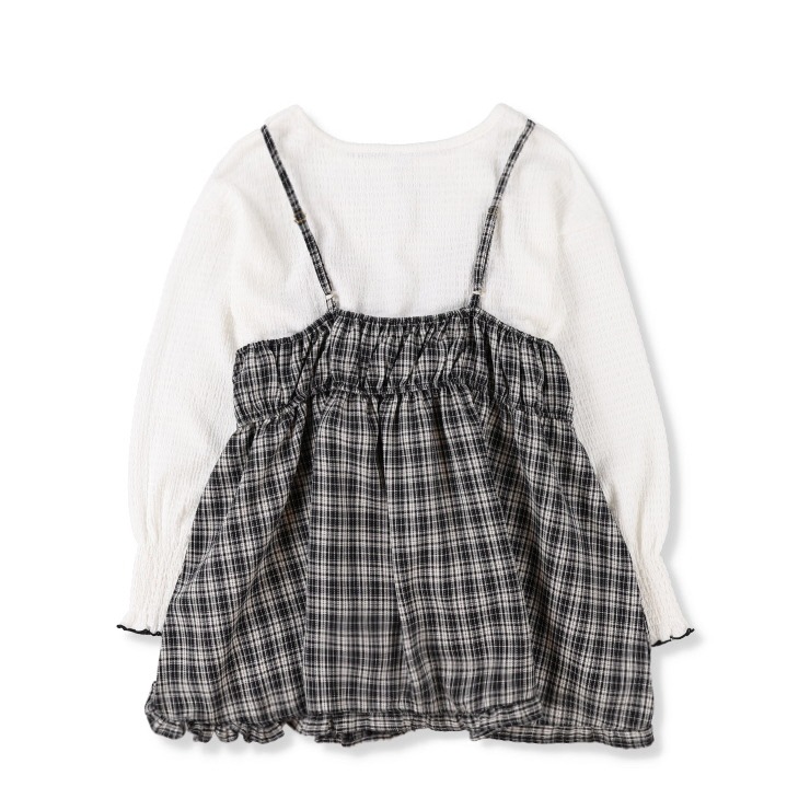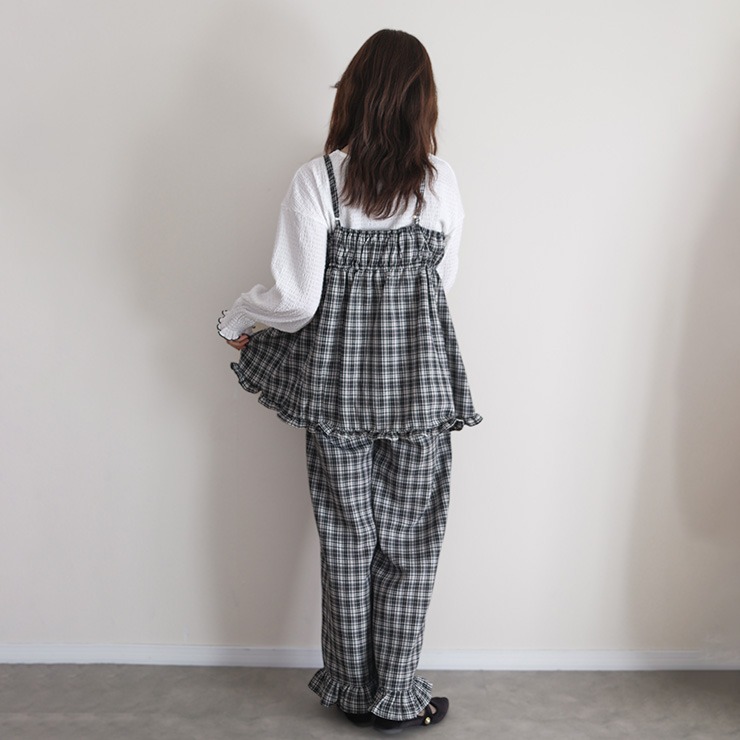 グレーのチェック柄のキャミソールと配色のメロウ加工を施したプルオーバーがセットになったアンサンブルです!