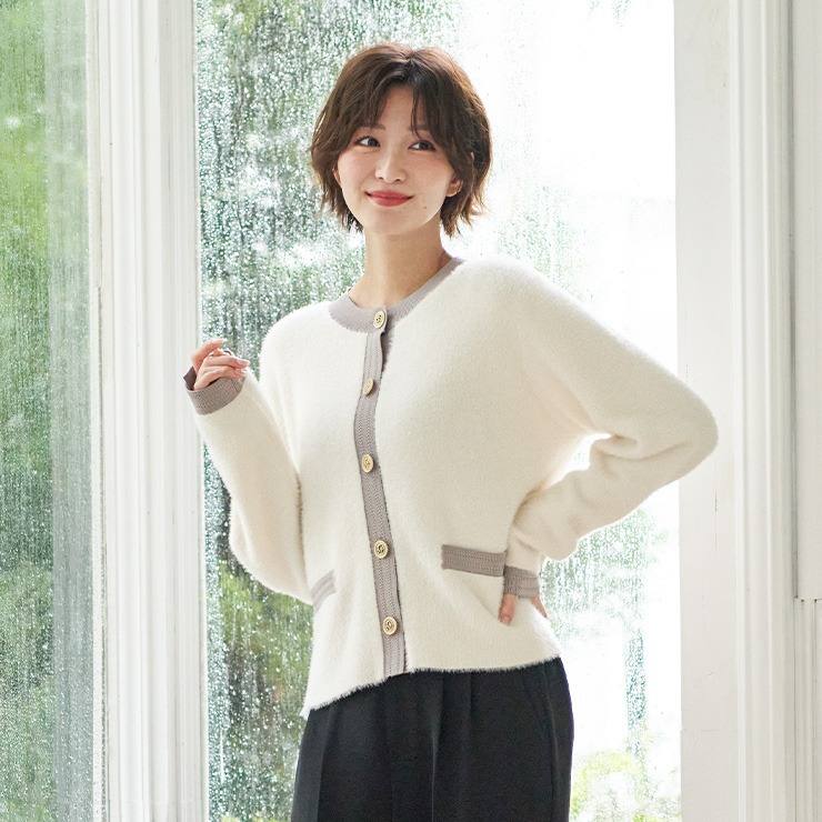 柔らかいシャギーヤーンニットカーデが配色で登場!