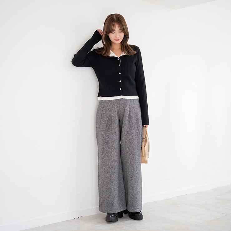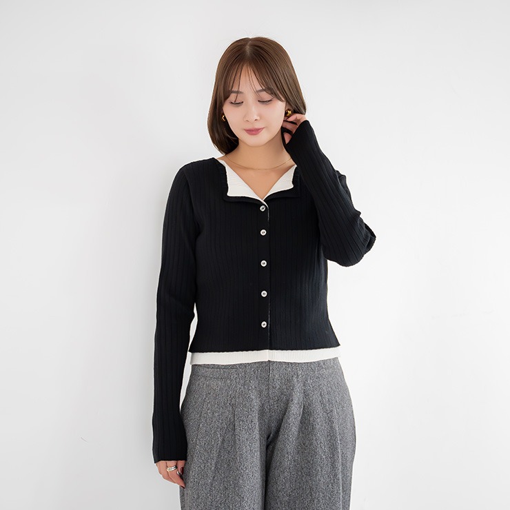 1枚でお洒落見えするレイヤード風ニットカーディガン。