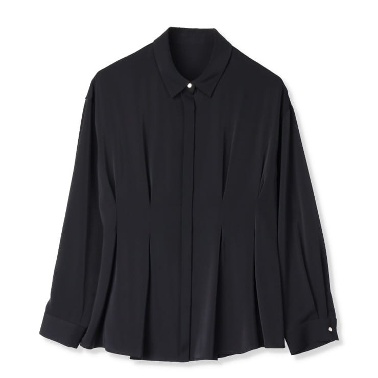 ウエストのタックで作ったペプラムシルエットがトレンド感を演出しつつ、襟付きブラウスで上品な印象を与えます。