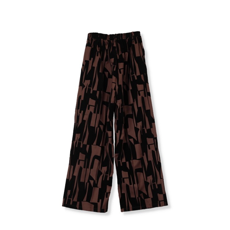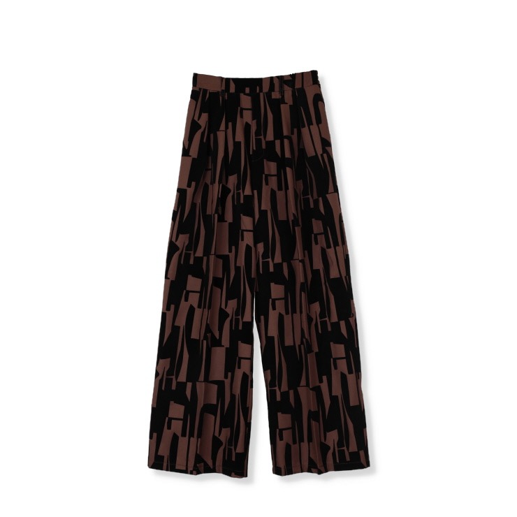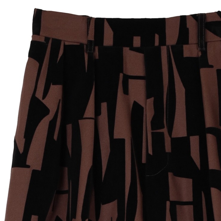ツイル生地にフロッキープリント加工した生地のワイドパンツ。