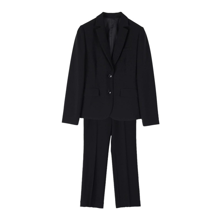 シルエットにこだわった2つボタンのテーラードジャケットと、すっきり見せながら後ろゴムで楽ちんに着られる定番ストレートパンツ、後ろゴムのタイトスカートのセットです。