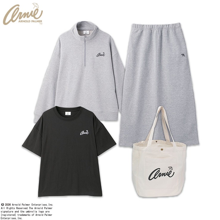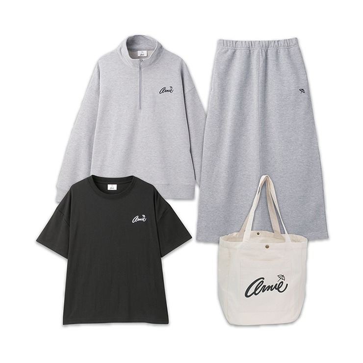 裏起毛のハーフジップトレーナー、スカートとTシャツ、トートバッグの4点セットです。