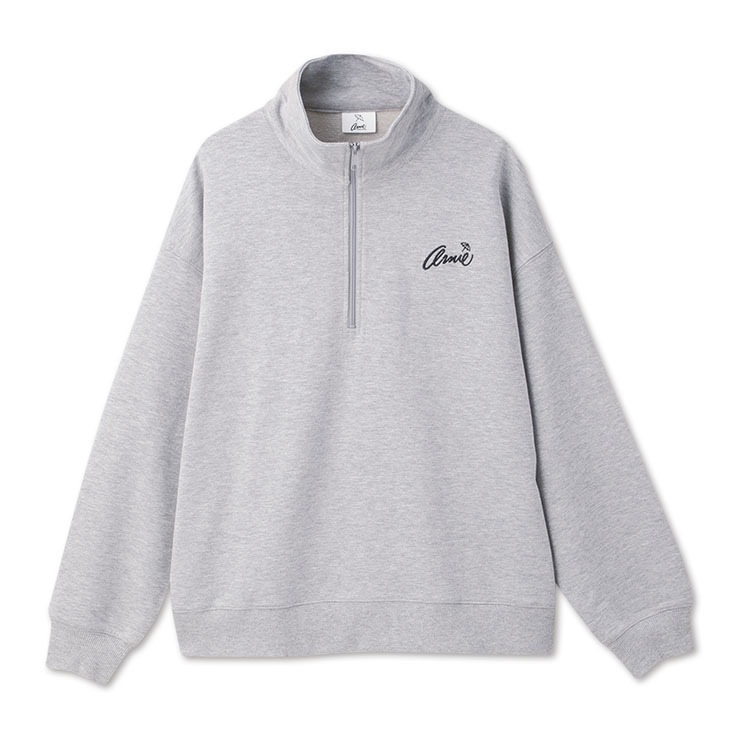 着合わせしやすいグレーのハーフジップトレーナーでインナーとしても1枚でも着用できます。