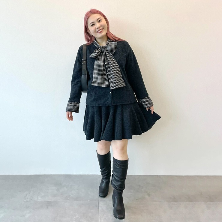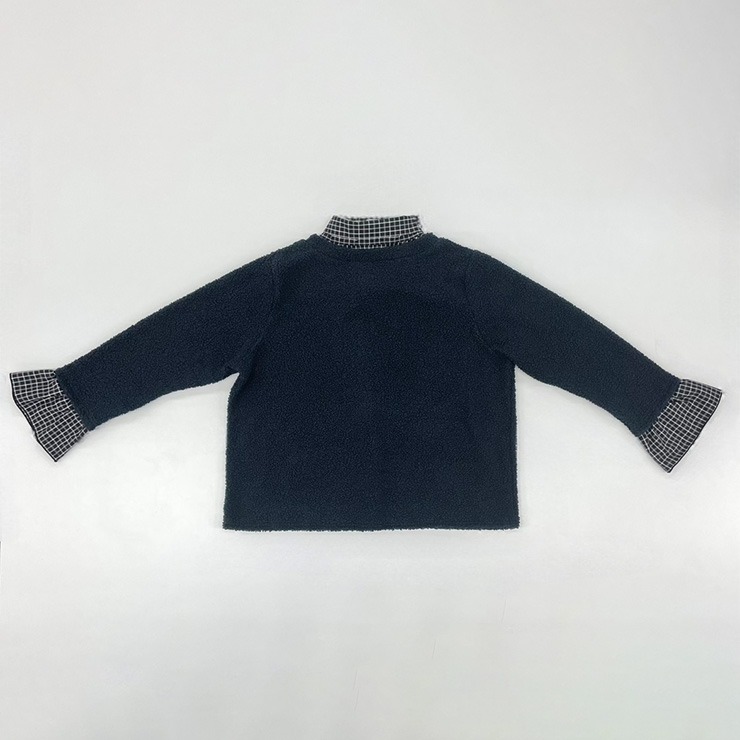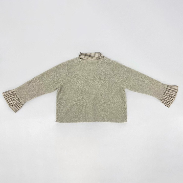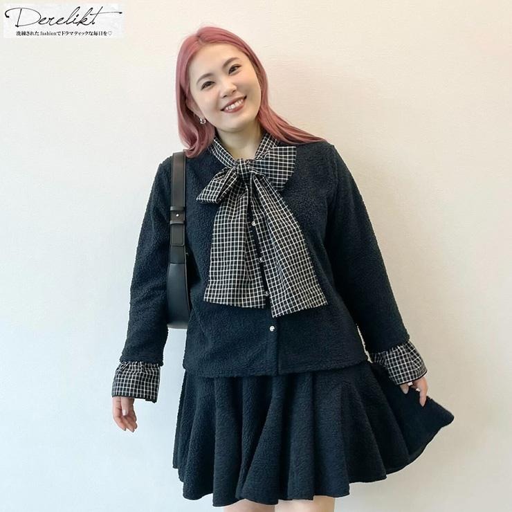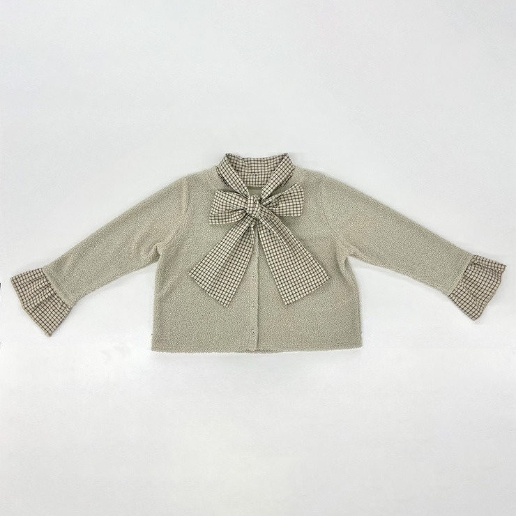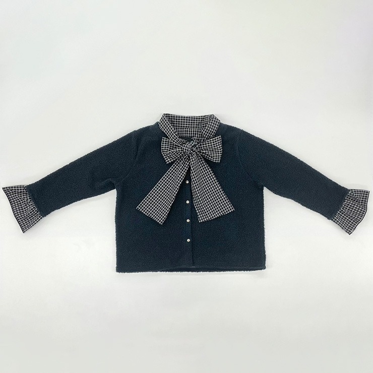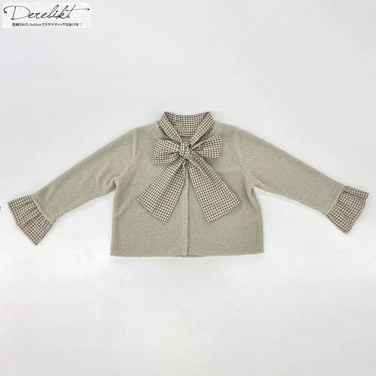 あたたかみのあるボア素材に、チェック柄のボウタイとカフスをドッキングした異素材デザインのトップス。