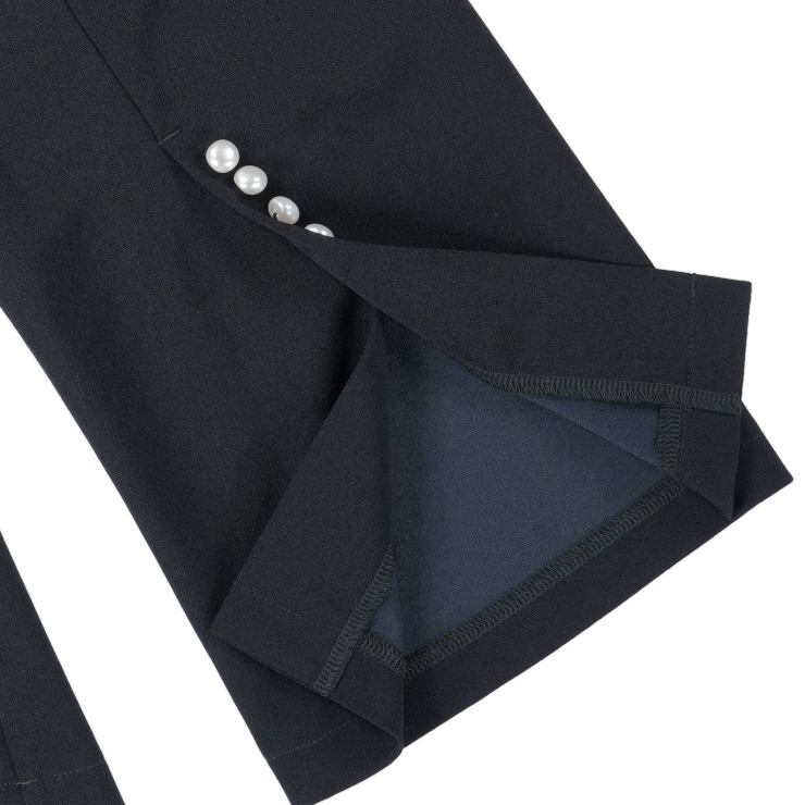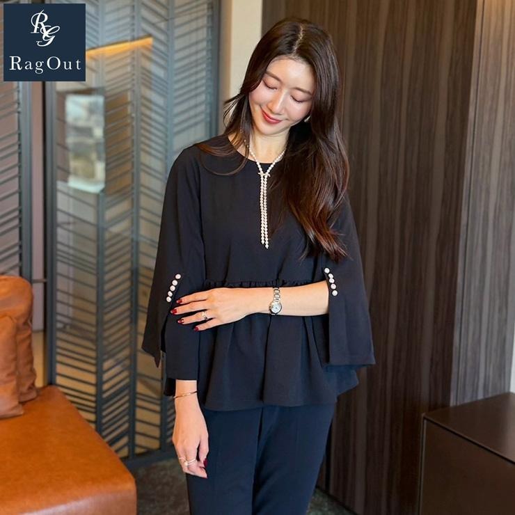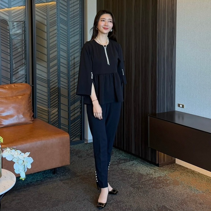 袖のスリットがトレンド感ありつつ、5連のパールで特別感も。