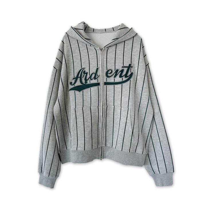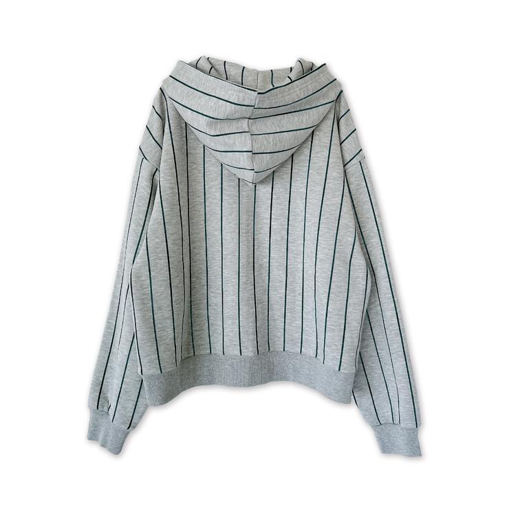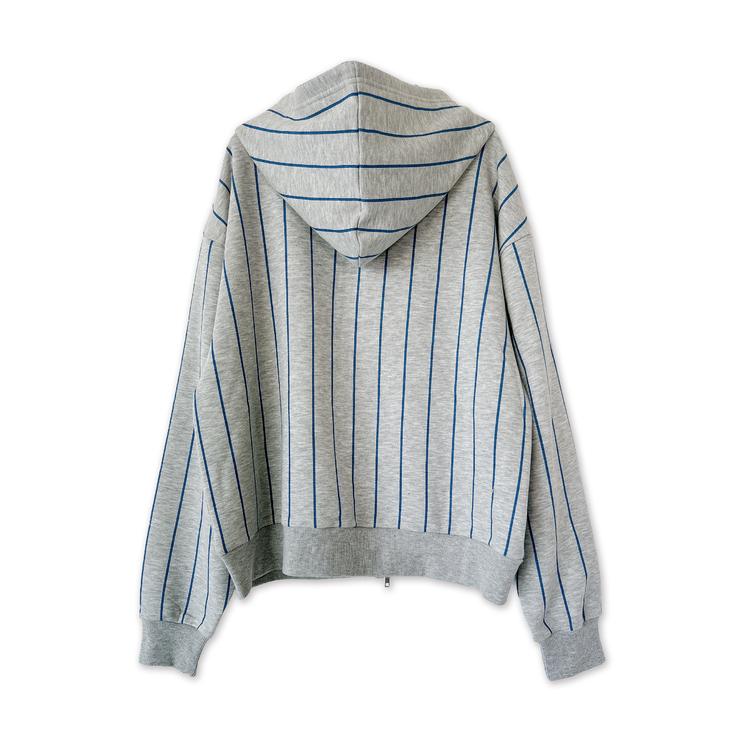 ツイルロゴ貼り付けのMizukiコラボのストライプ柄のジップパーカ。