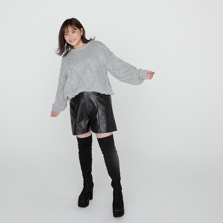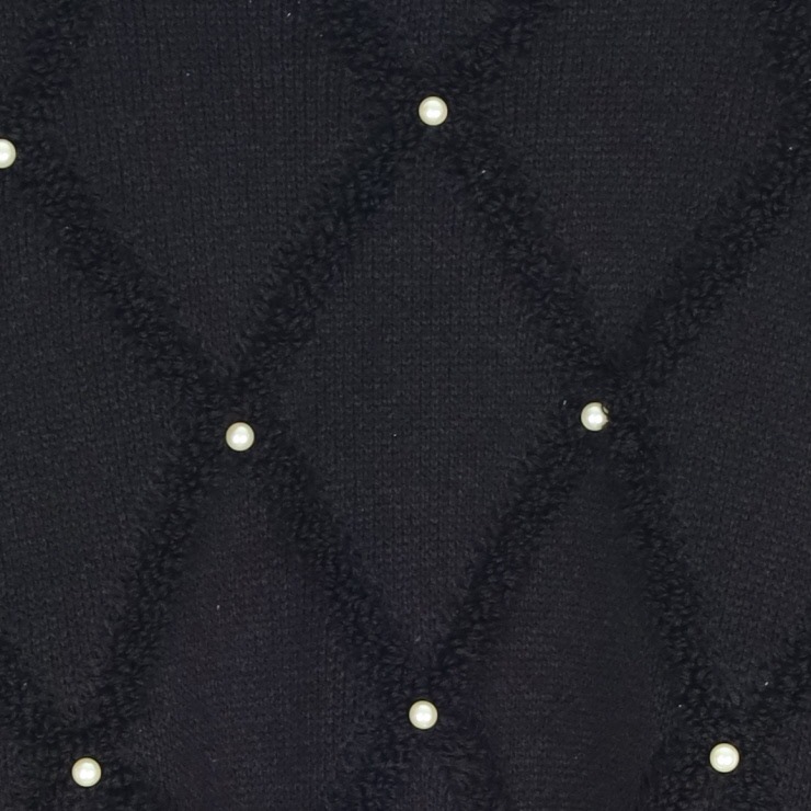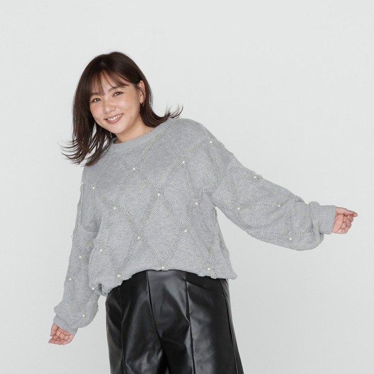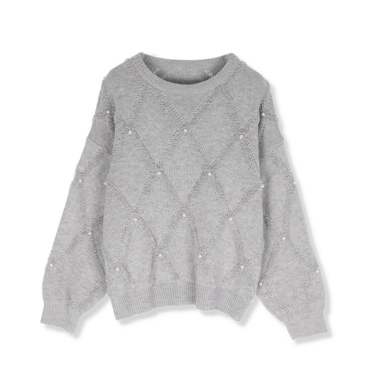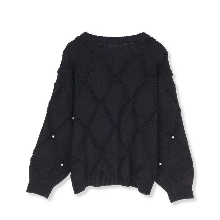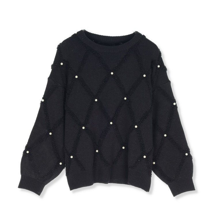 トレンドのダイヤ柄にきらめくビジューをあしらった華やかなニットプルオーバー。