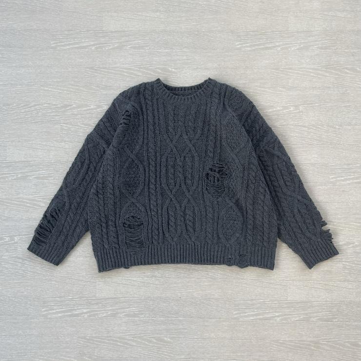 ベーシックなケーブルニットに施したダメージ加工がポイントです。