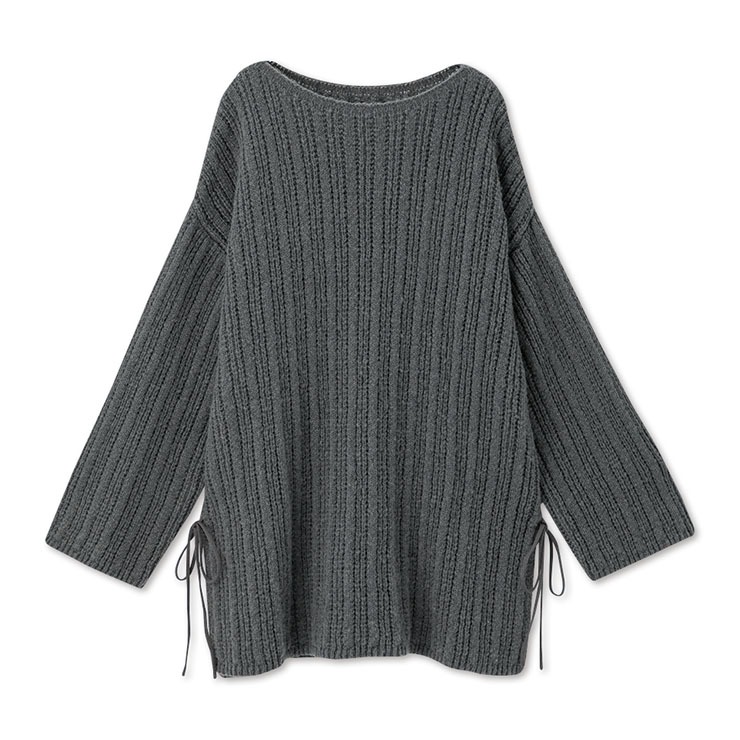今季注目のドローストリングデザインを取り入れたチュニック丈ニット。