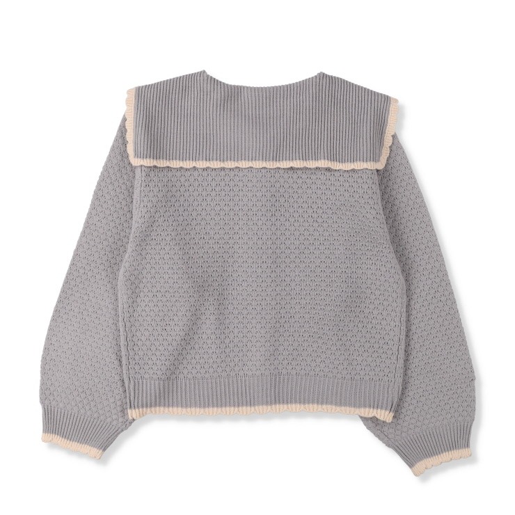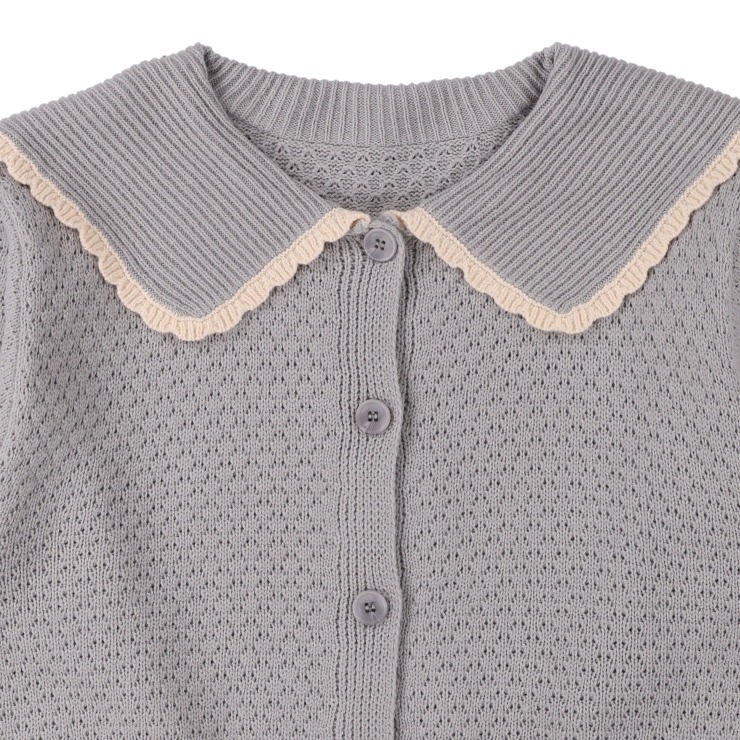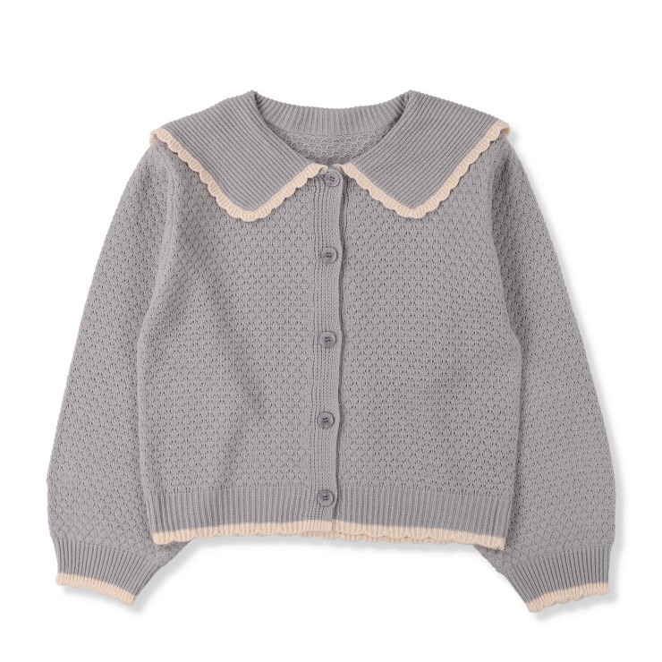 大きめの丸襟に配色のスカラップをあしらったニットカーディガン。