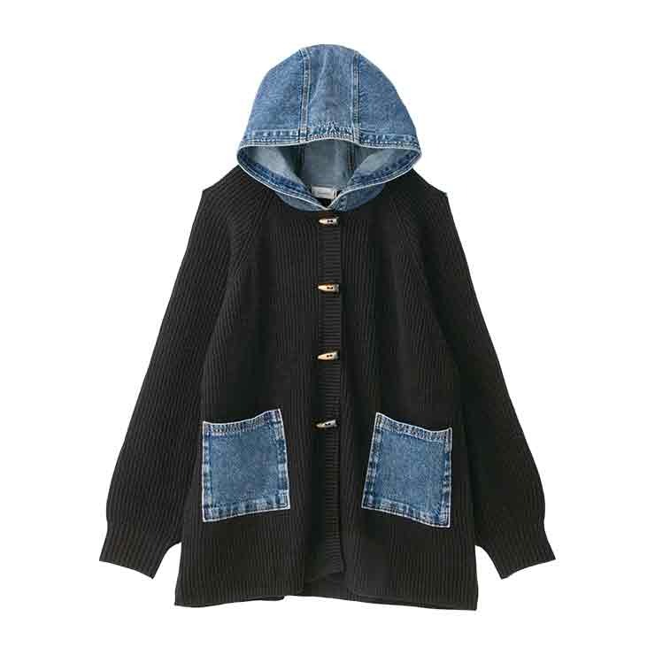 レディース デニム使いフード付ニットカーディガン(Denifits)