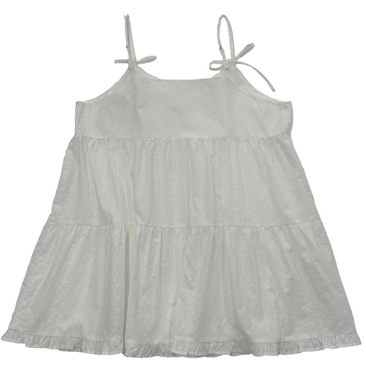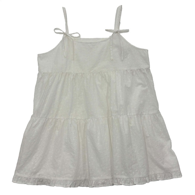 綿100%のカットワーク刺しゅうレースを全体に使用した華やかさと、あえて白に統一した鮮麗さが印象的なキャミ型チュニックです。