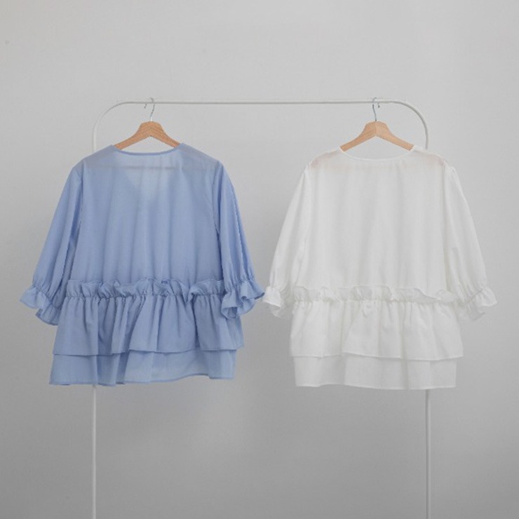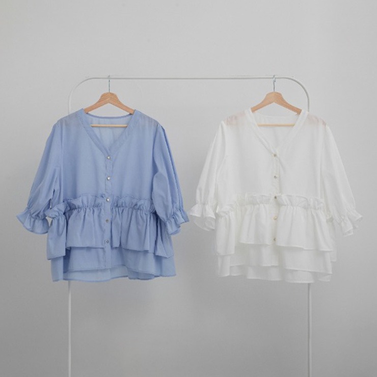 ペプラムシルエットのシャツに、キャンディースリーブを合わせたデザインで、女性らしく華やかな印象に。