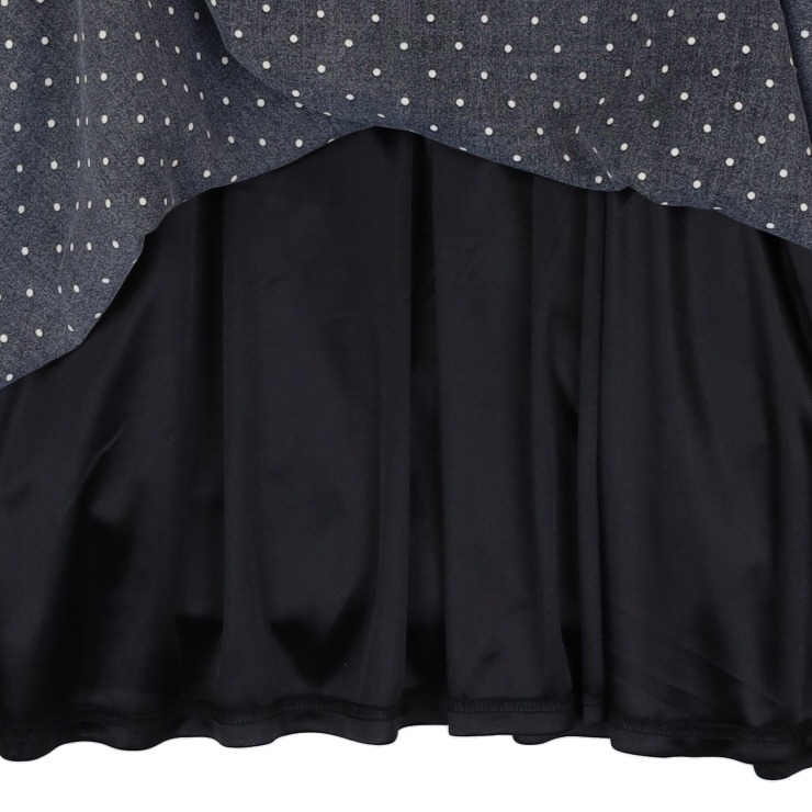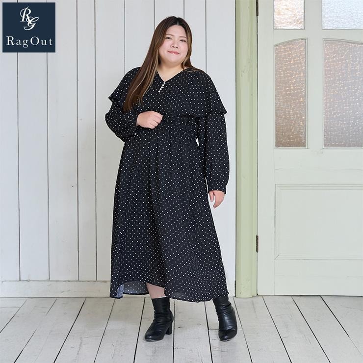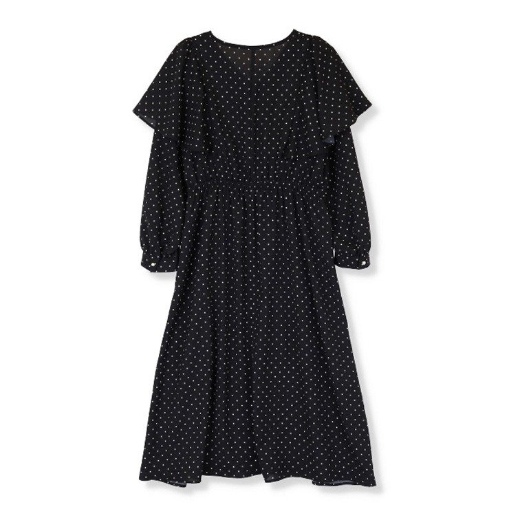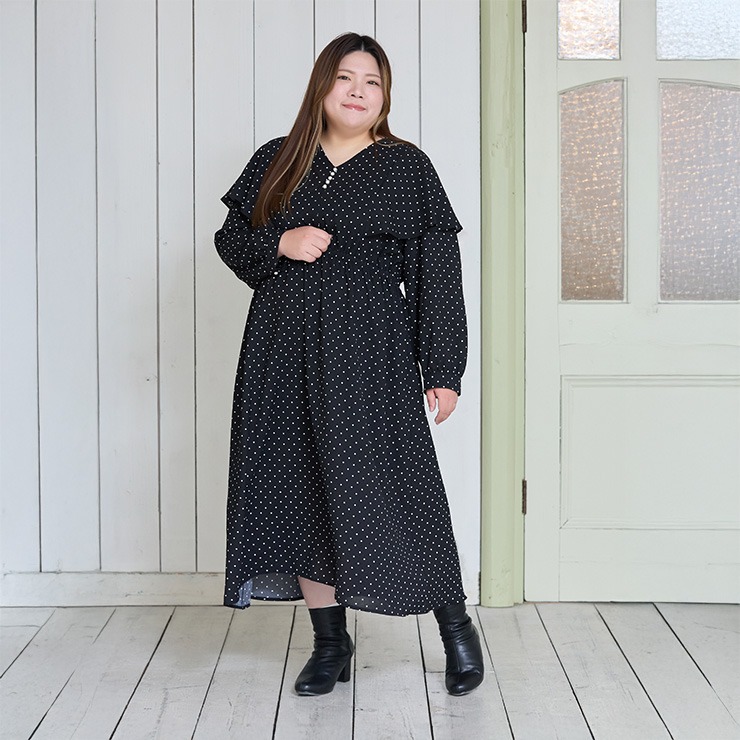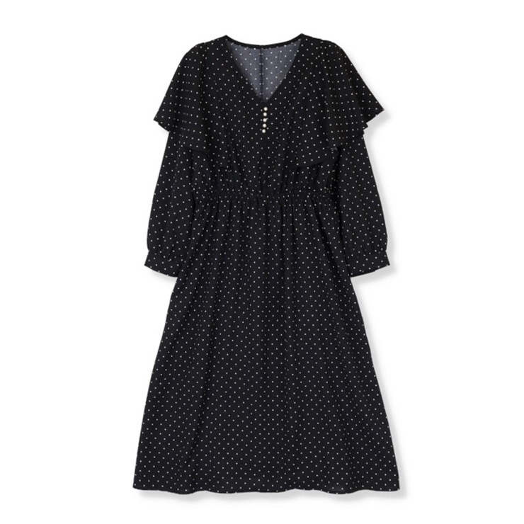 ドット柄と、肩にフリルが付いたデザインがポイントのロングワンピース。