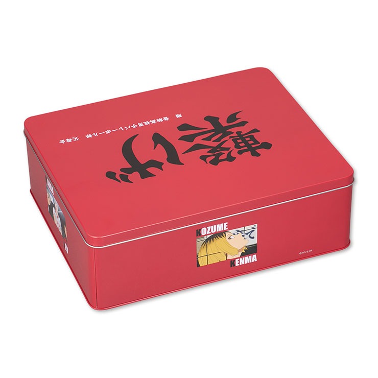 蓋には横断幕のデザイン、側面には場面写がプリントされた缶です。