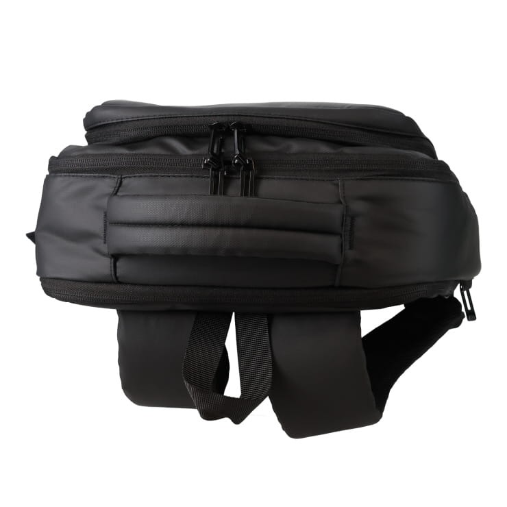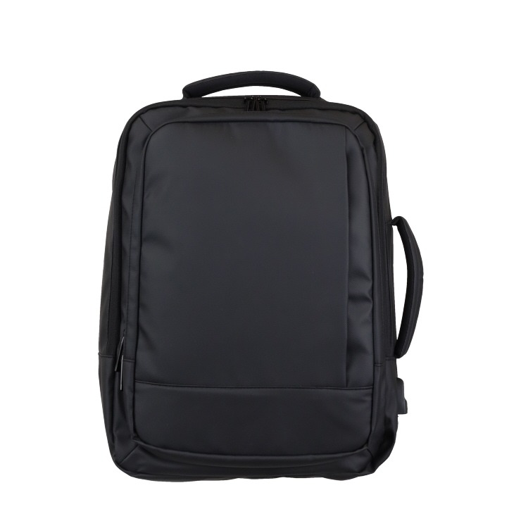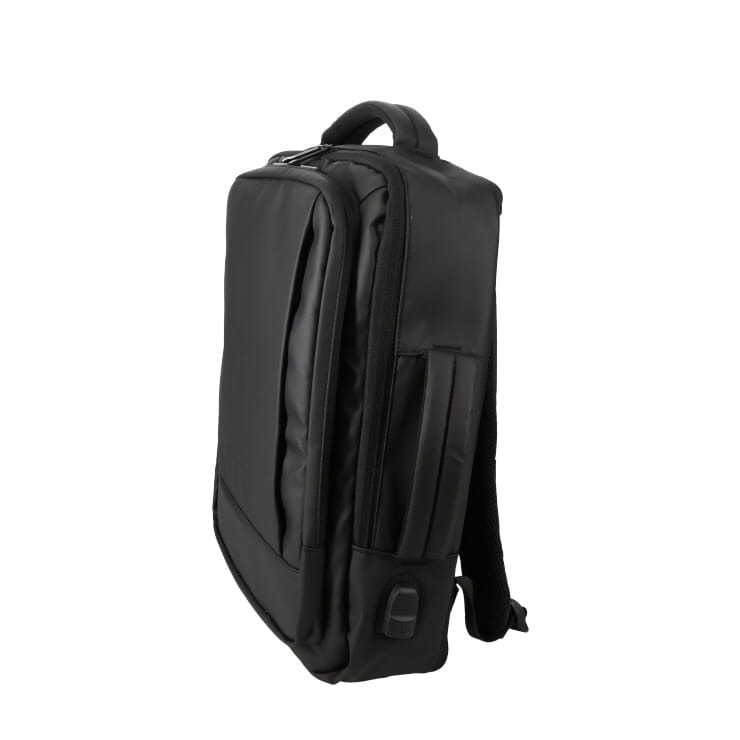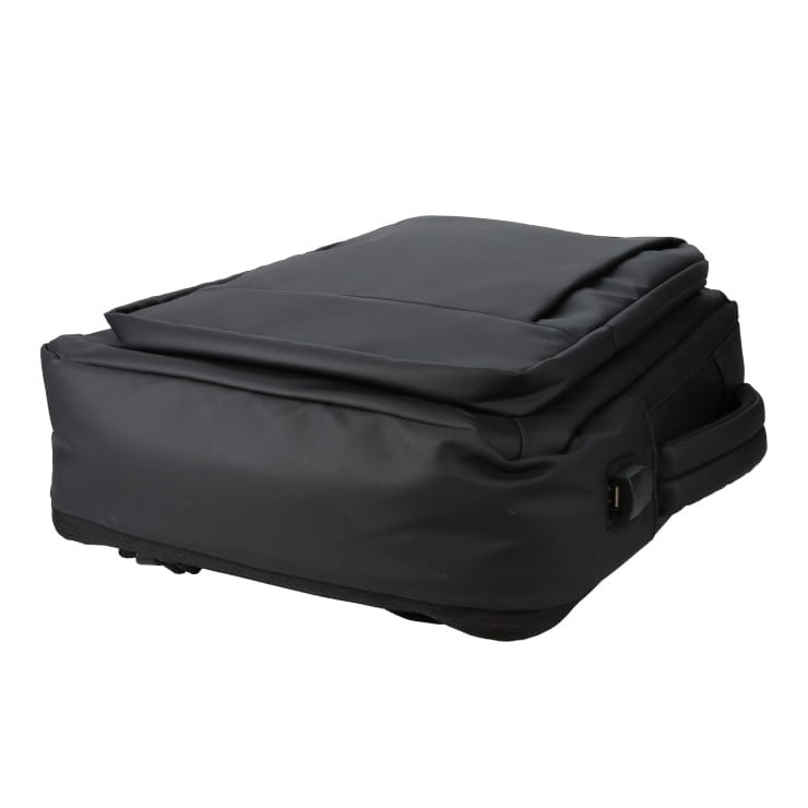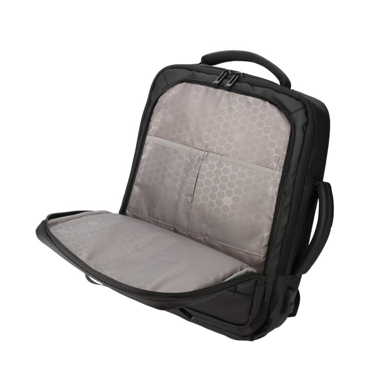 多機能ポケットと独立PC収納、USB充電ポート付き。