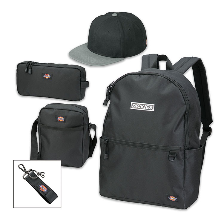 バックパック、ショルダーバッグ、ポーチ、キャップ、キーチャームのお得な5点セットです。