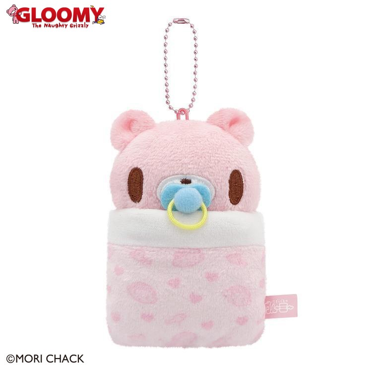 ふわふわのおふとんに入っているべビーグルーミーのぬいぐるみマスコットです。