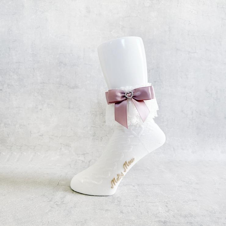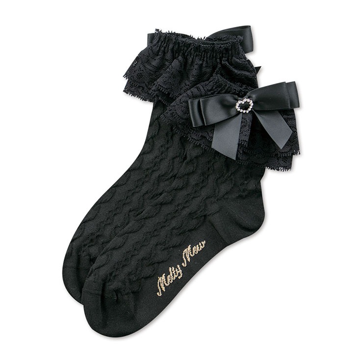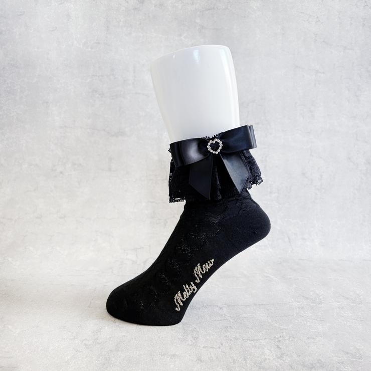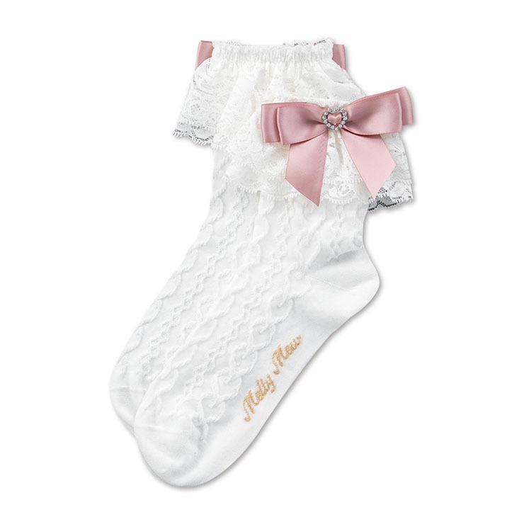 履き口のレースとハートモチーフ付きのリボンモチーフが特徴のクルーソックスです◎