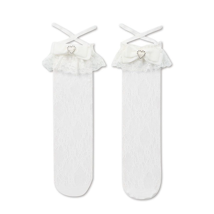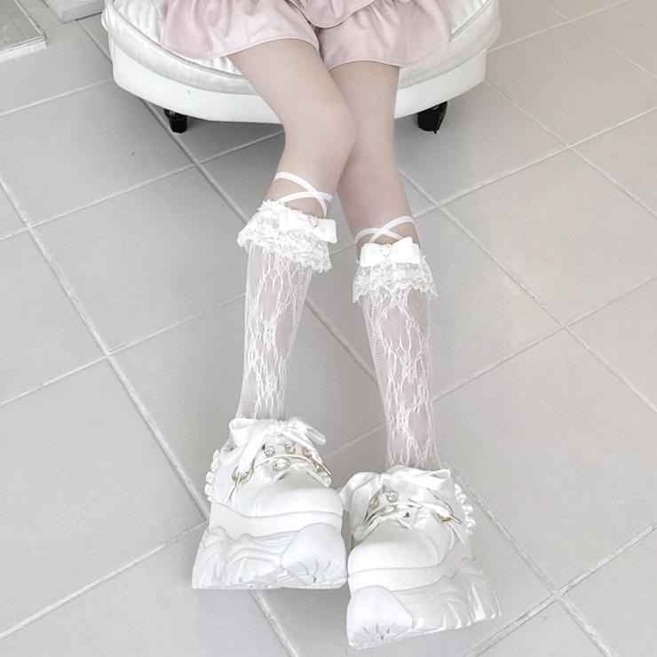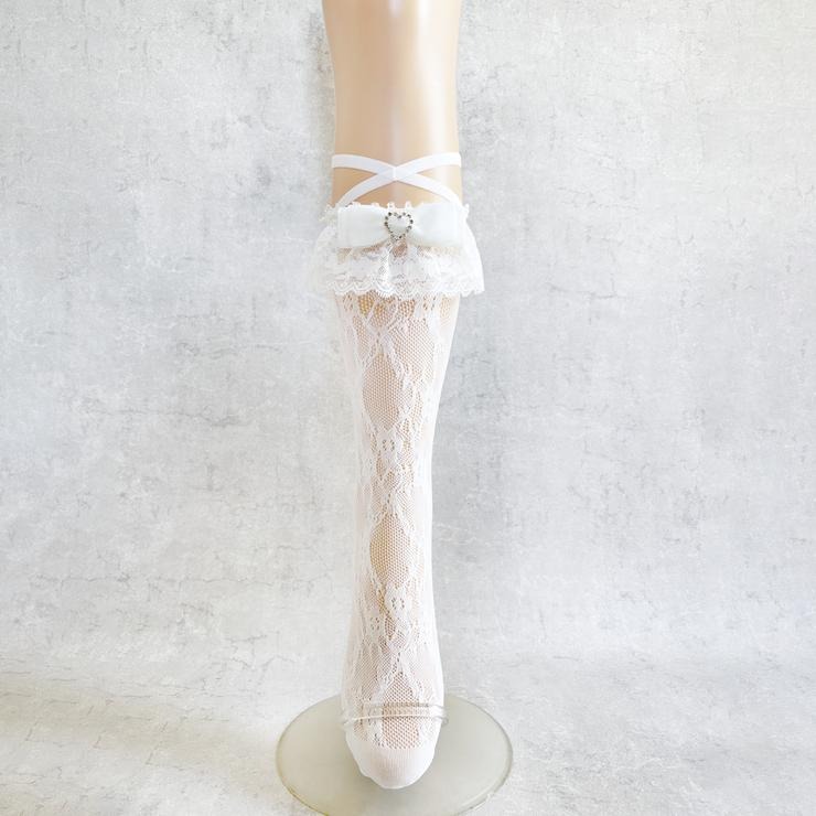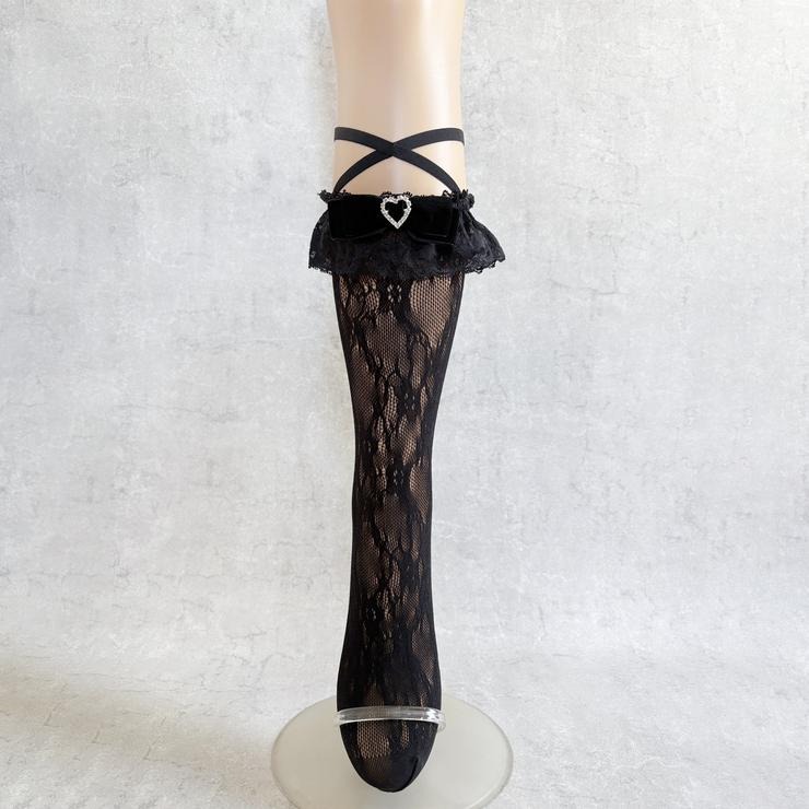 花柄レースデザインのクロスガーター付靴下に、履き口のレースとリボンモチーフが特徴のハイソックスです◎