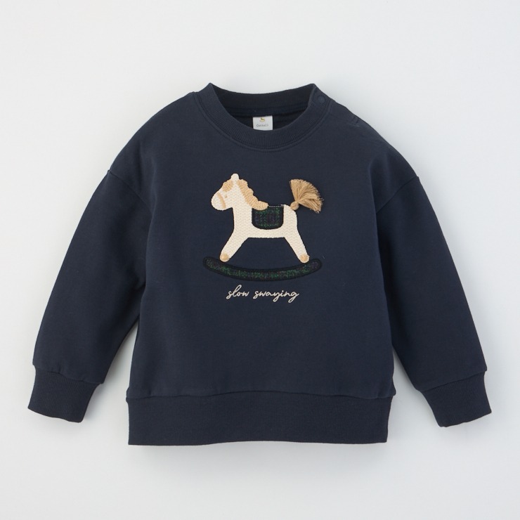 木馬モチーフのニットパーツにチェック柄のアップリケがついたおしゃれなデザインになっています。