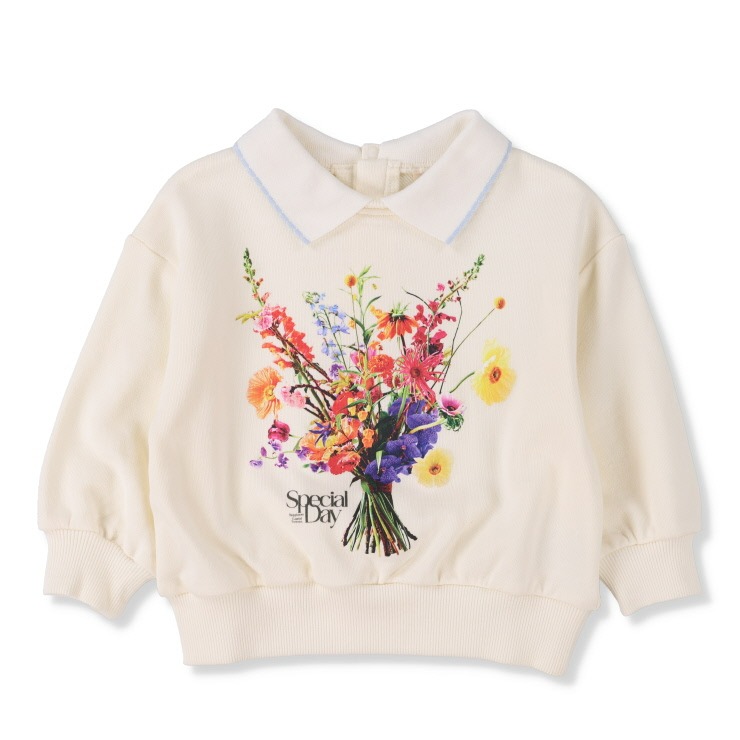 重ね着しているような衿付きデザインにお花の転写プリントがかわいいです。