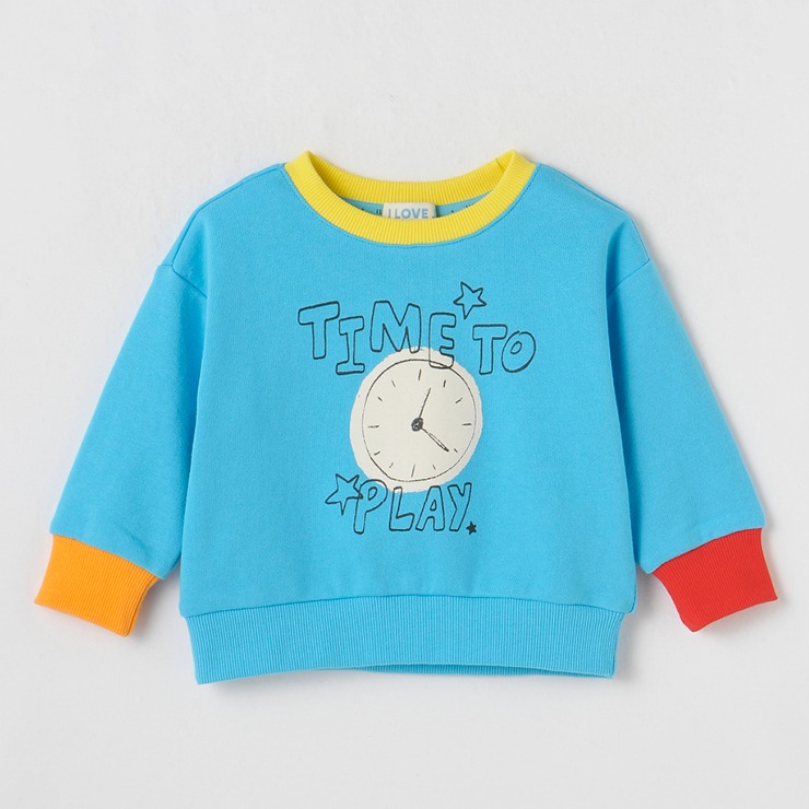 クレヨン風に仕上げた前身頃のプリントとリブ配色が特徴です。コットン100%の裏毛素材を使用したトレーナーで1枚でも重ね着でも使いやすいです。