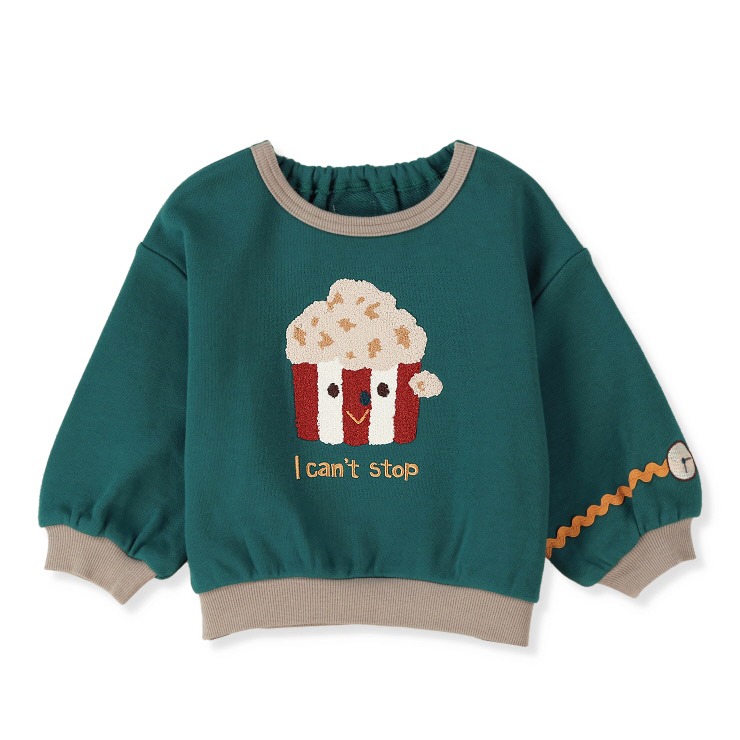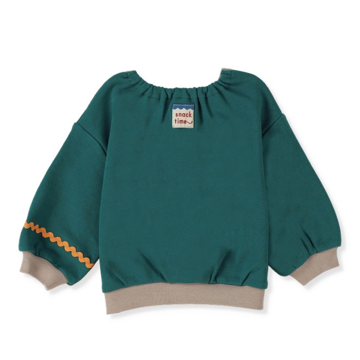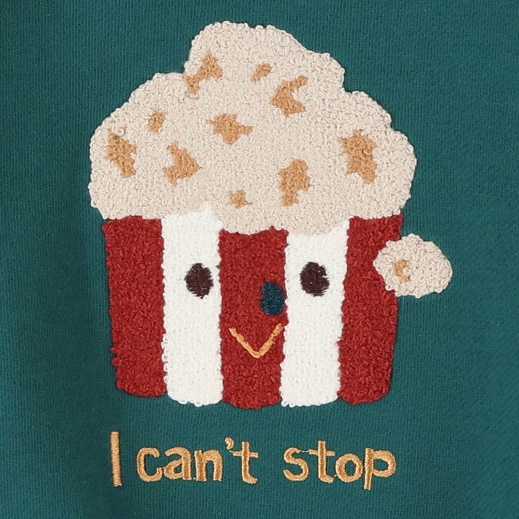 サガラ刺しゅうのモコモコがとってもかわいい!袖でには時計の刺しゅうで”おやつの時間”を表現。