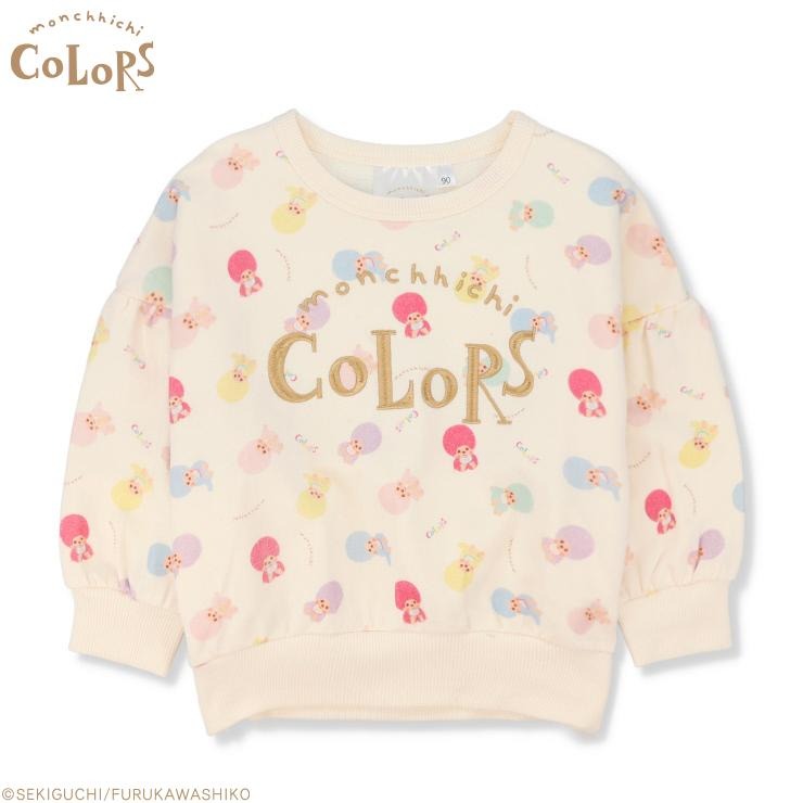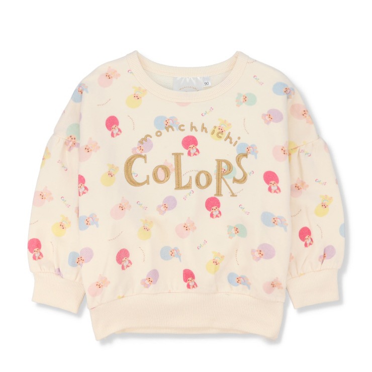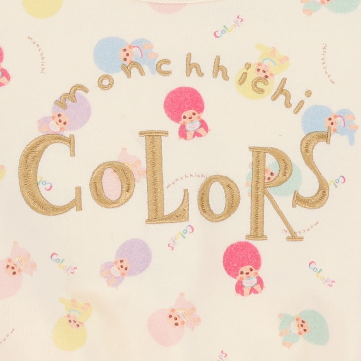 カラフルな総柄モンチッチの生地に、ロゴの刺しゅうがかわいい1枚です。