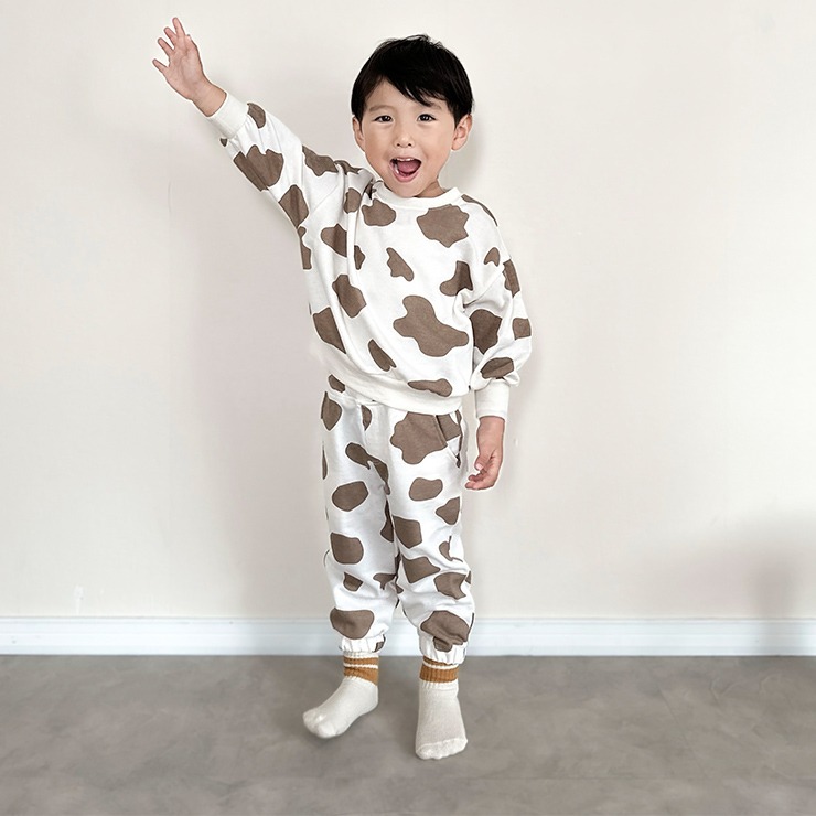カウ柄が目を惹く綿混の裏毛素材を使用したロングパンツです。