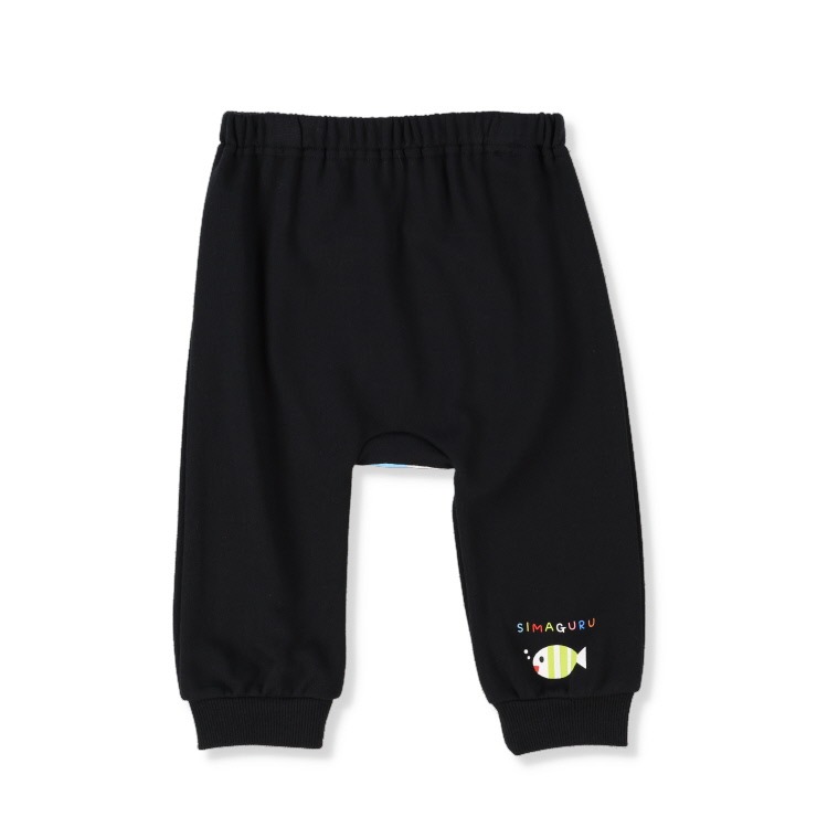 「いっしょにあそぼ」シリーズ大人気絵本NO,1『しましまぐるぐる』の黒、白、赤などのコントラストがかわいいモンキーパンツです。